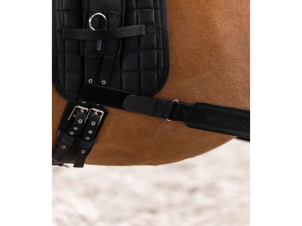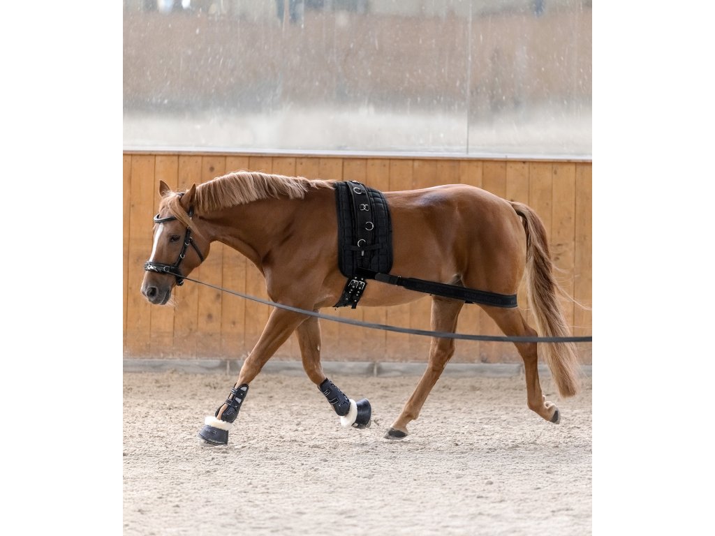 Speciální bandáž, která slouží jako pomůcka pro zlepšení rovnováhy, koordinace a posílení svalstva. Podporuje aktivní zapojení zadních končetin, čímž napomáhá ke správnému nasvalení zádových a břišních svalů. Výsledkem je efektivnější a uvolněnější pohyb při práci na lonži i pod sedlem. Bandáž je vyrobena z vysoce elastického materiálu, který se skvěle přizpůsobí pohybu koně. Díky oboustrannému suchému zipu ji snadno upevníte k lonžovacímu nebo běžnému podbřišníku. Délku lze snadno nastavit podle individuálních potřeb koně. Rozměry (COB/FULL): délka bez natažení: cca 1,70 m až 1,90 m, při natažení až do: cca 2,80 m.