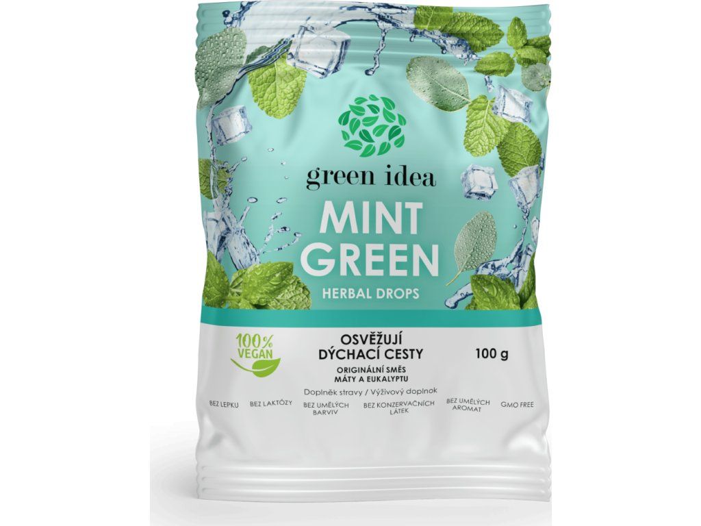 Bylinné bonbóny Mint green obsahují extrakt z máty a esenciální oleje z eucalyptu a máty, které osvěžují hrdlo a krk, omezují zápach z úst. Mají harmonickou chuť, osvěží dech a přispějí k normální funkci dýchacích cest. Bez lepku, bez laktózy, bez umělých barviv, bez konzervačních látek, GMO free, 100% vegan. Doplněk stravy.