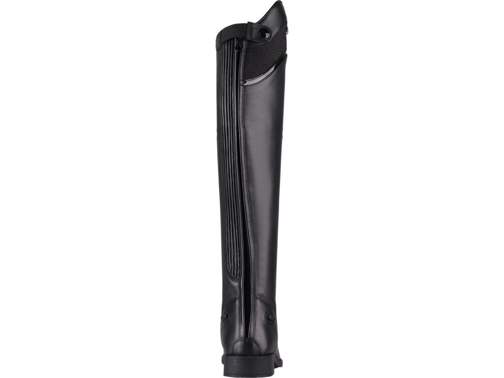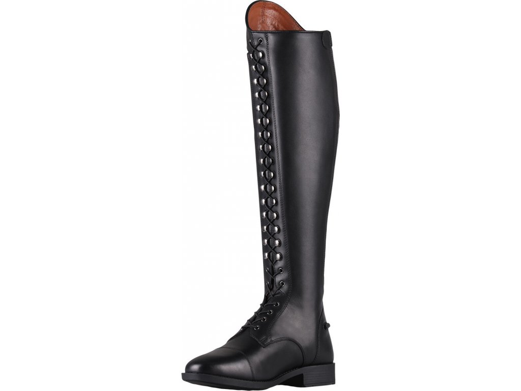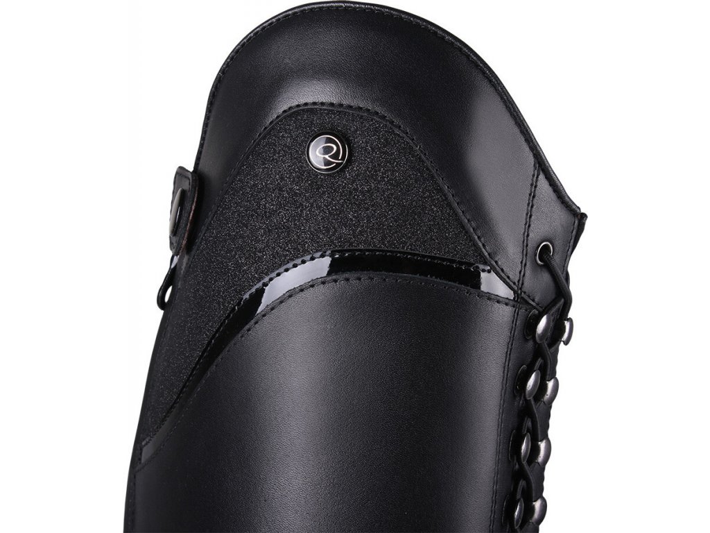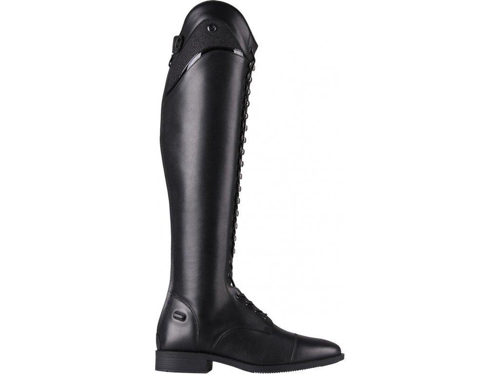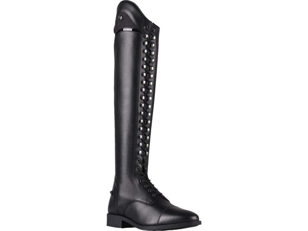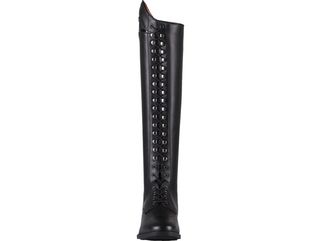 Velmi kvalitní jezdecké boty pro mladistvé jsou vyrobeny z hovězí lakované kůže. Opatřeny jsou zipem na zadní straně, který usnadňuje obouvání. Zip je navíc jištěn drukem a po obou stranách je opatřen elastickou vložku pro maximální komfort. Zdobeny jsou dlouhým šněrováním, který společně se třpytivými detaily dodávají botám elegantní vzhled. Boty jsou k dispozici také v dámských velikostech.