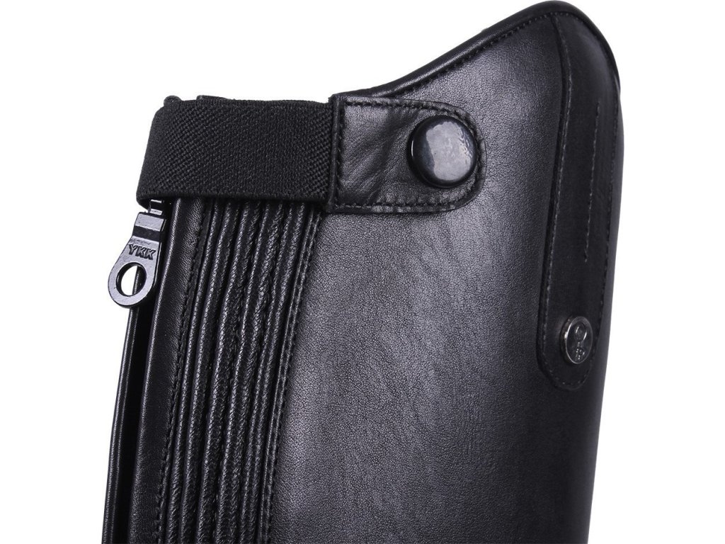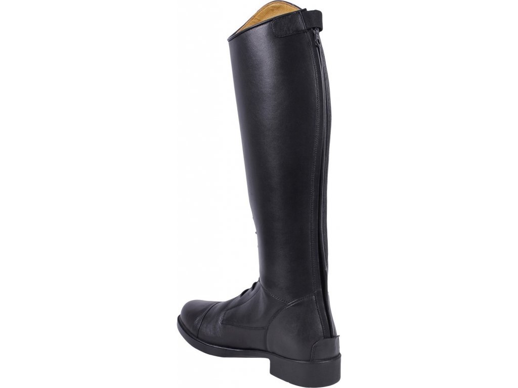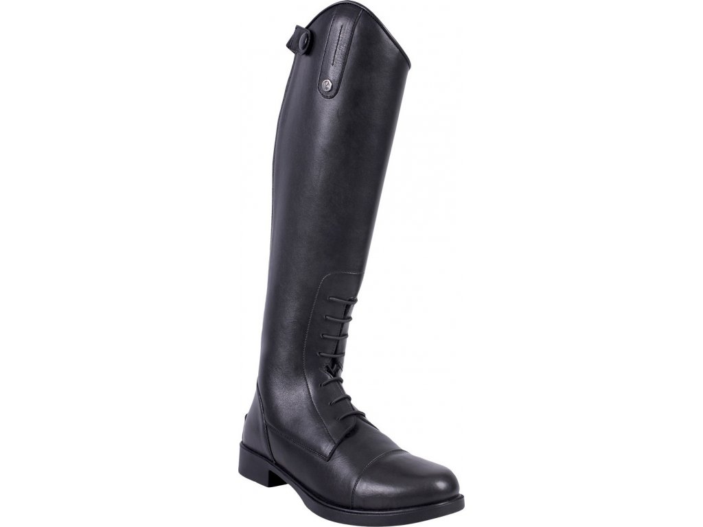Kvalitní jezdecké boty vyrobené z hovězí kůže. Vybavené předním elegantním šňěrováním a pružným elastickým páskem u zipu na zadní straně. Vhodné pro standardní velikost lýtka. V horné části boty zdobené popruhem a knoflíkem QHP. Podšívka je opatřena prodyšnou látkou. Vnitřní podešev je z umělé kůže. Boty se prodávají také ve variantě pro širší lýtko.