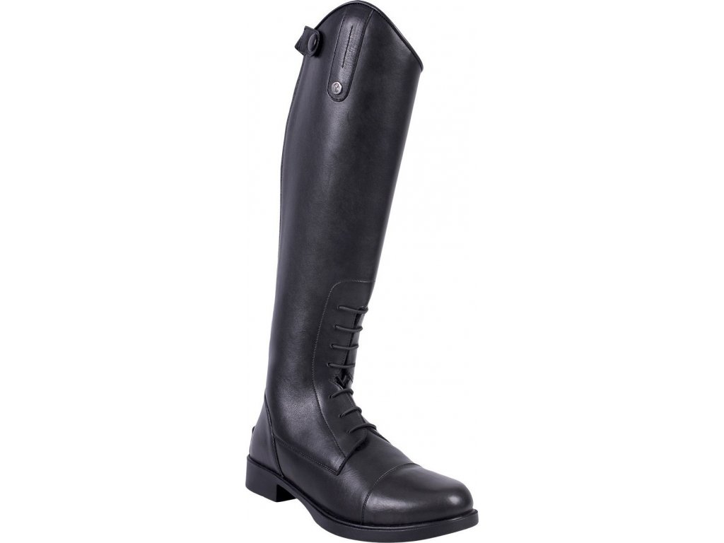 Kvalitní jezdecké boty vyrobené z hovězí kůže. Vybavené předním elegantním šňěrováním a pružným elastickým páskem u zipu na zadní straně. Vhodné pro standardní velikost lýtka. V horné části boty zdobené popruhem a knoflíkem QHP. Podšívka je opatřena prodyšnou látkou. Vnitřní podešev je z umělé kůže. Boty se prodávají také ve variantě pro běžné velikosti lýtka.