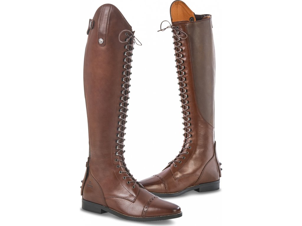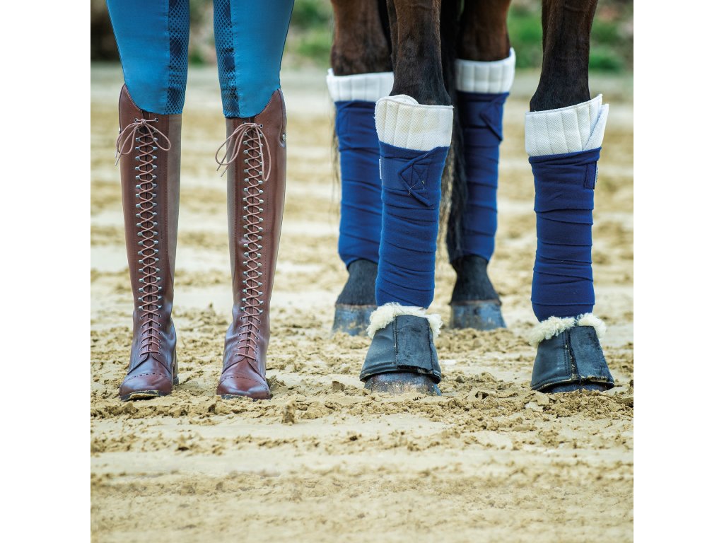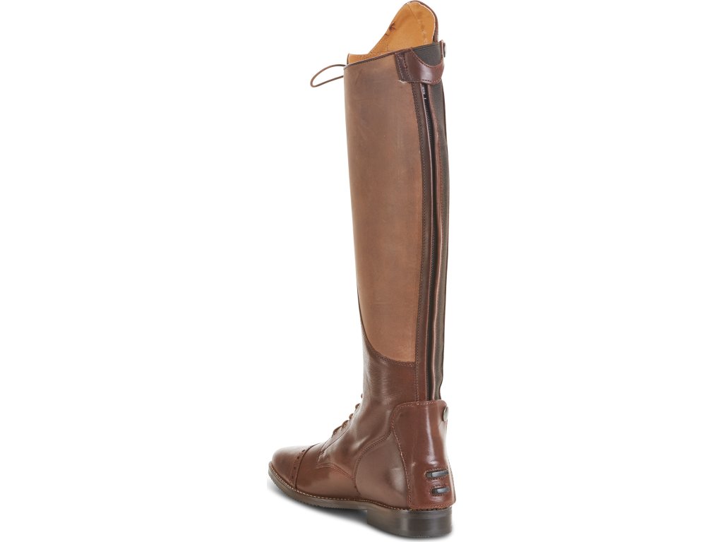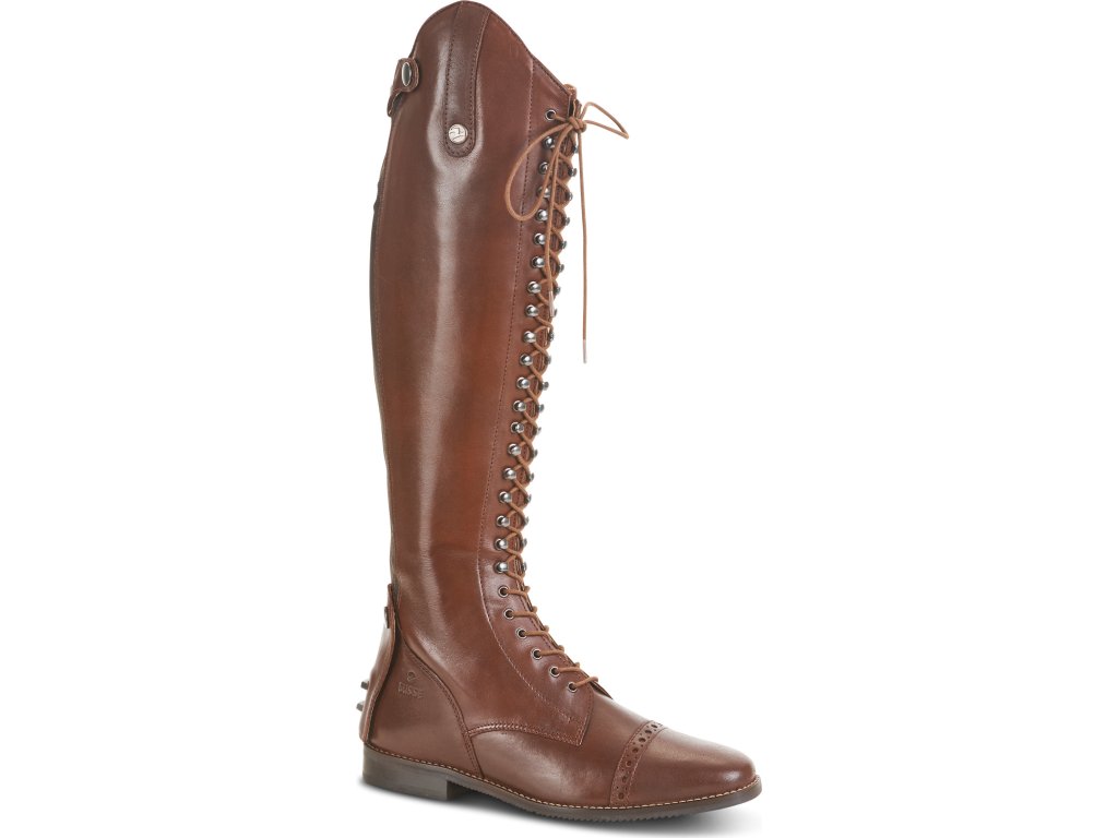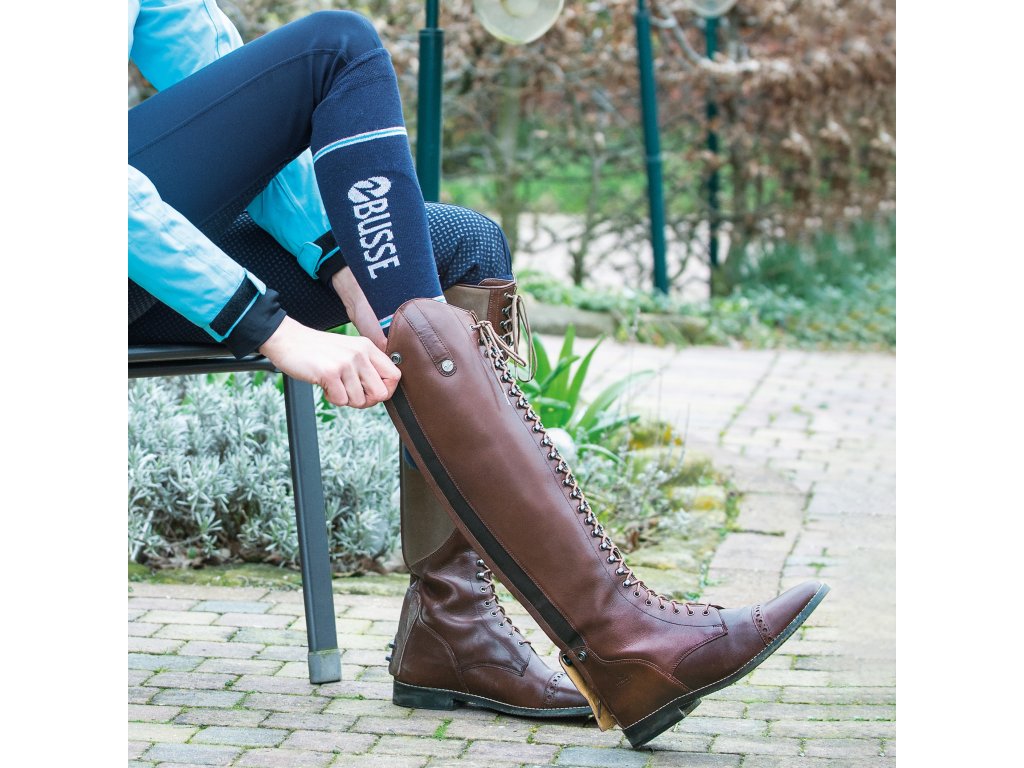 Vysoké jezdecké boty vyrobené z kvalitní brazilské hovězí kůže s elegantním šněrováním. Praktické šněrování poskytuje snadné přizpůsobení požadovaného tvaru lýtka. Díky jazyku, který je připevněný suchým zipem, zůstane šněrování při vyzouvání i nazouvání na místě. Zapínání pomocí podšitého YKK® zipu po celé zadní délce s elastickou vložkou pro snadné nazouvání (elastická vložka s rozptylem až 1 cm). Pomocí koženého pásku a druku lze zip snadno zajistit. Boty jsou dále vybaveny koženou klopou s drukem ve spodní části a s přídavnými zarážkami pro ostruhy. Vnitřní strana je vyrobena z protiskluzové kůže pro perfektní přilnutí. Boty mají gumovou protiskluzovou podrážku a zesílenou patu. Ručně vyrobená pryžová podešev s odnímatelnou, tvarovanou stélkou absorbující nárazy pro pohodlné celodenní nošení. Jezdecké boty Laval Busse jsou k dispozici i v černé, modré, šedé a cognac barvě. K botám lze zakoupit tkaničky v několika barvách. Dále jsou boty k dispozici v různých kombinacích šířky a délky.