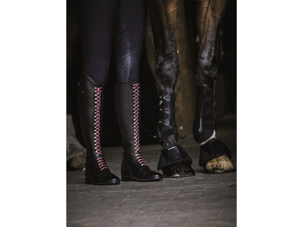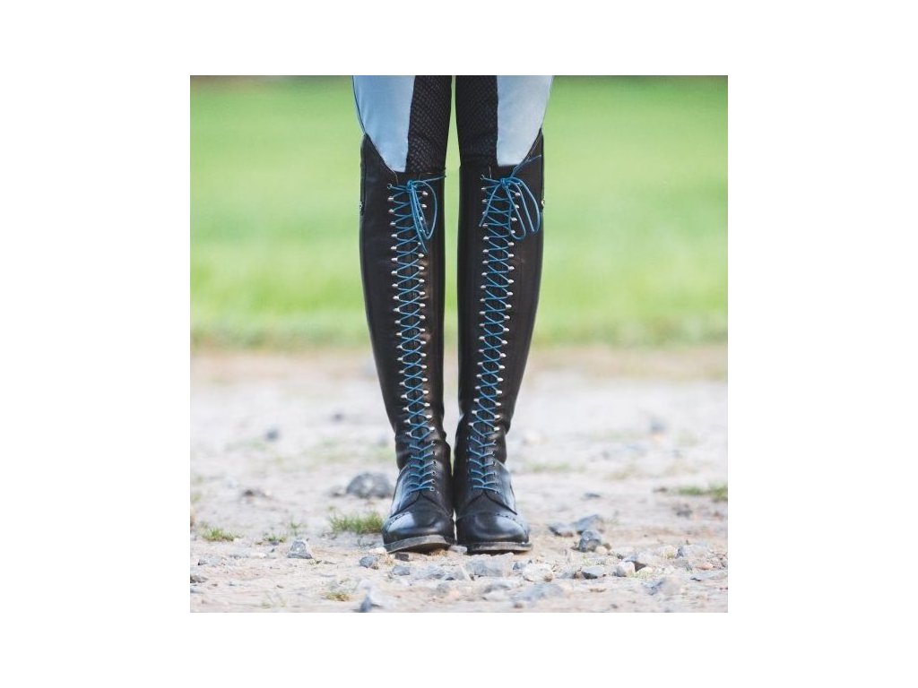 Vysoké jezdecké boty vyrobené z kvalitní brazilské hovězí kůže s elegantním šněrováním. Praktické šněrování poskytuje snadné přizpůsobení požadovaného tvaru lýtka. Díky jazyku, který je připevněný suchým zipem, zůstane šněrování při vyzouvání i nazouvání na místě. Zapínání pomocí podšitého YKK® zipu po celé zadní délce s elastickou vložkou pro snadné nazouvání (elastická vložka s rozptylem až 1 cm). Pomocí koženého pásku a druku lze zip snadno zajistit. Boty jsou dále vybaveny koženou klopou s drukem ve spodní části a s přídavnými zarážkami pro ostruhy. Vnitřní strana je vyrobena z protiskluzové kůže pro perfektní přilnutí. Boty mají gumovou protiskluzovou podrážku a zesílenou patu. Ručně vyrobená pryžová podešev s odnímatelnou, tvarovanou stélkou absorbující nárazy pro pohodlné celodenní nošení. Jezdecké boty Laval Busse jsou k dispozici i v šedé, modré, hnědé a cognac barvě. K botám lze zakoupit tkaničky v několika barvách. Dále jsou boty k dispozici v různých kombinacích šířky a délky.