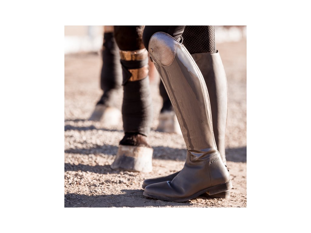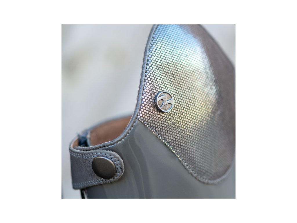 Zajímavá jezdecká dámská obuv, která nabízí perfektní rovnováhu mezi funkčností a okouzlujícím vzhledem. Boty jsou elegantní, pohodlné s přiléhavým střihem. Holeň je z pravé lakované kůže a spodní část vyrobená z nejlepší evropské obuvnické kůže. Lýtková část je z odolné kůže se speciálními adhezivními vlastnostmi pro perfektní přilnavost. Podšívka z pravé kůže. Podložený zip YKK® v přední části boty pro snadné obouvání s perfektní celkovou ergonomií v sedle. Zip je v horní části chráněn koženou klopou na patentní knoflík. Elastická vsadka na zadní vnější straně zajistí optimální se přizpůsobení lýtku s rozptylem až 8 mm. Pevná patní část s dvojitými výstupky pro správné držení ostruh. Gumová podešev je ručně vyráběná s protiskluzovým zvlněným profilem a pevnou patou. Vyjímatelná, předtvarovaná stélka, která tlumí nárazy. K dispozici v šedé a černé barvě. Dále jsou boty k dispozici v různých kombinacích šířky a délky.