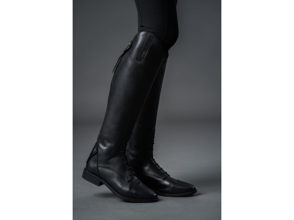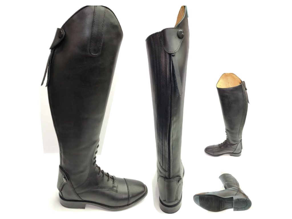 Vysoce kvalitní vysoké jezdecké boty vyrobené z měkké hovězí kůže. Opatřeny jsou kvalitním YKK zipem po celé zadní délce s elastickou vložkou, která zajišťuje maximální přizpůsobení. Zip je jištěný druky. Boty jsou opatřeny ozdobným elastickým šněrováním a zarážkama na šporny. Tento typ je pro širší lýtko. K dispozici i v jiném provedení.