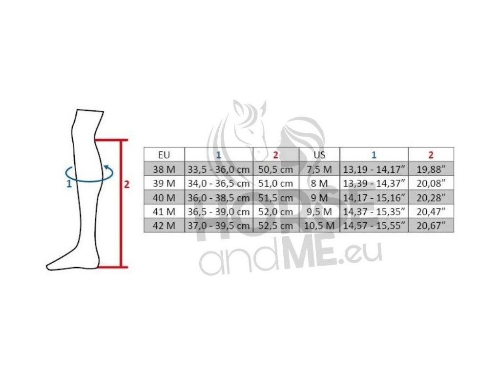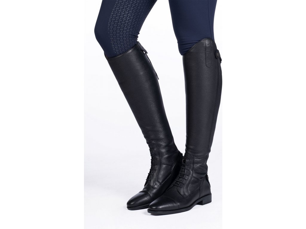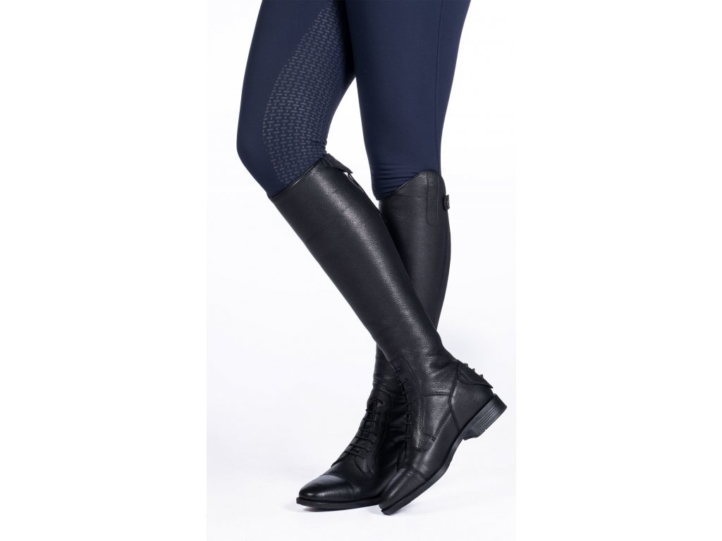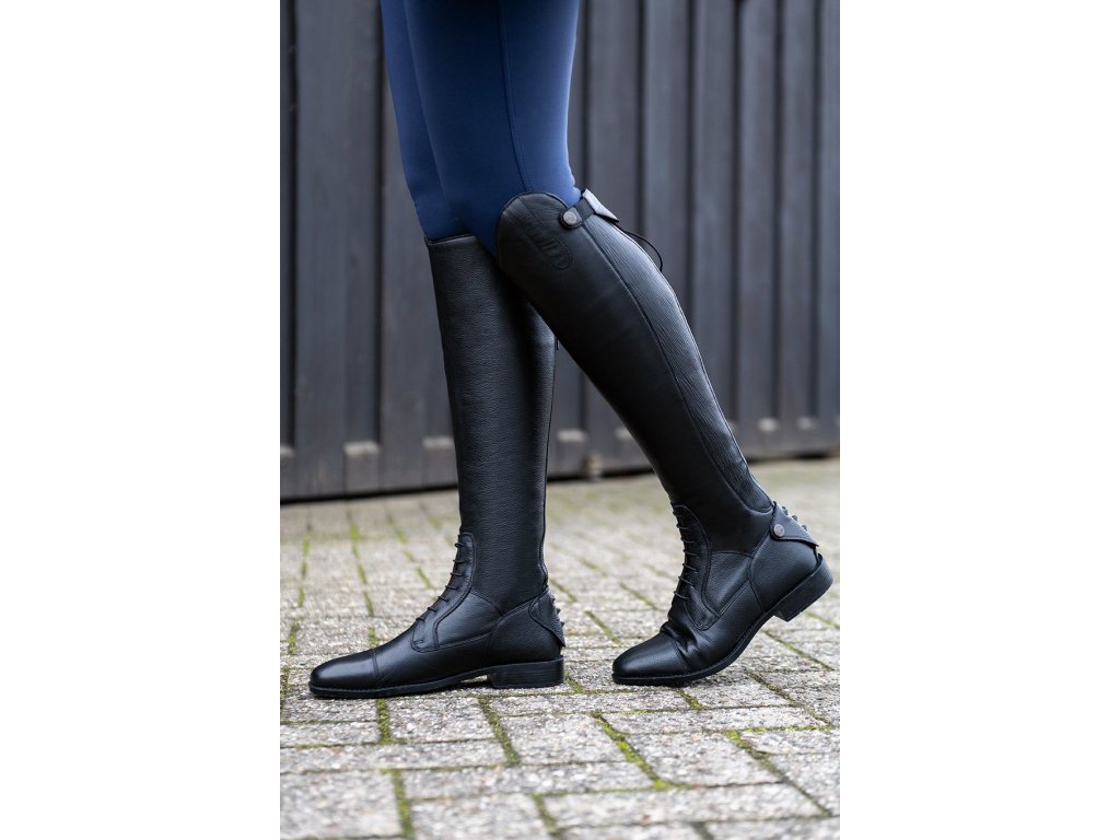 Vysoce kvalitní jezdecké boty z hovězí kůže. Paměťová pěnová stélka a extra měkká podšívka zajišťují maximální pohodlí. Vnitřní podšívka se silikonovým potiskem zabraňuje prohýbání boty. Opatřeny zapínáním na zip po celé zadní straně, který je jištěn drukem nahoře i dole. Kolem zipu se nachází elastický díl, který zajišťuje dokonalé přizpůsobení. Vybaveny elastickým šněrováním a syntetickou podrážkou. Boty jsou vhodné pro extra vysokou holeň s šířkou M.