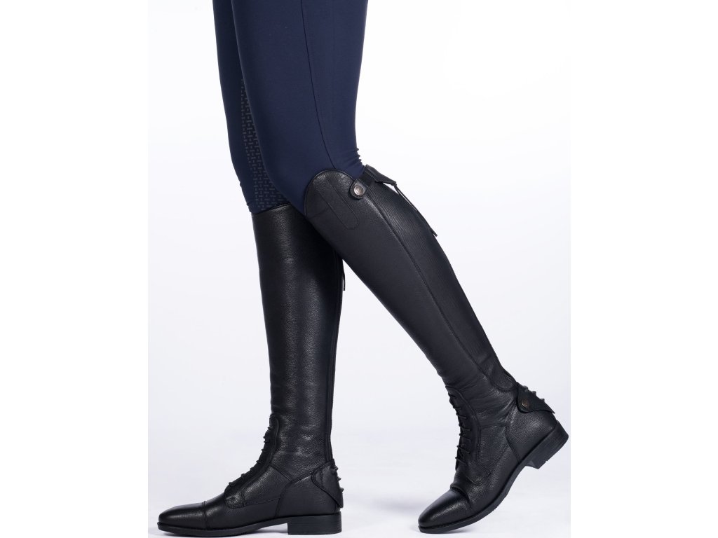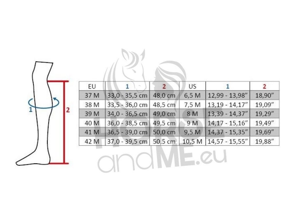 Vysoce kvalitní jezdecké boty z hovězí kůže. Paměťová pěnová stélka a extra měkká podšívka zajišťují maximální pohodlí. Vnitřní podšívka se silikonovým potiskem zabraňuje prohýbání boty. Opatřeny zapínáním na zip po celé zadní straně, který je jištěn drukem nahoře i dole. Kolem zipu se nachází elastický díl, který zajišťuje dokonalé přizpůsobení. Vybaveny elastickým šněrováním a syntetickou podrážkou. Boty jsou vhodné pro vysokou holeň s šířkou M.