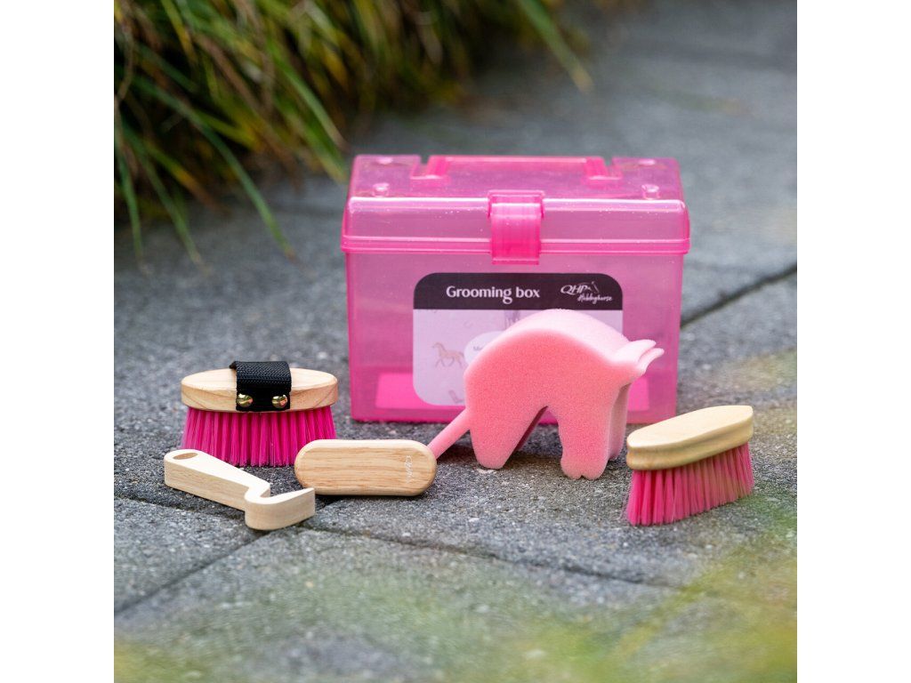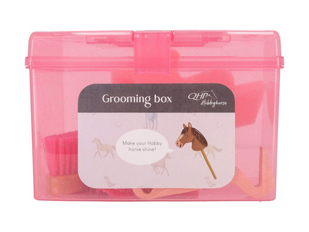 Box na čištění pro Hobby horse. Box je vybaven praktickou rukojetí pro snadnou manipulaci. Je vyroben z odolného polypropylenu, díky kterému je lehký a zároveň pevný. Součástí boxu je sada čisticího příslušenství. Obsahuje: měkký kartáč, tvrdý kartáč, kartáč na hlavu, háček na kopyta a houbu ve tvaru koně. Tato výbava poskytuje vše potřebné pro důkladné čištění a údržbu vašeho Hobby Horse. Upozornění: Tento produkt je určen jako doplněk k plyšovým hračkám.