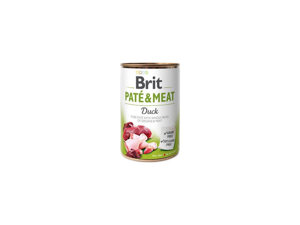 Kompletní krmivo pro psy, 70% kachna a kuře + čisté masové paté. Skutečné kousky masa s celými kousky vnitřností v paté. Vysoký podíl kvalitního masa a jeho šetrné zpracování je zárukou excelentní chuti i vůně. Lahodné kombinace skutečných masových kousků a orgánového masa v paté dokonale uspokojí i ty nejnáročnější psí gurmány. Brit Paté & Meat je ideálním doplňkem i ke granulím. Pomáhá zlepšit příjem krmiva a doplnit tekutiny. Bez obilovin – bez soji – bez GMO.