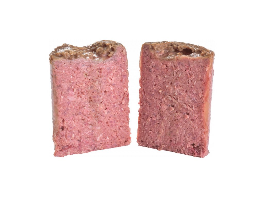 Masové paté s tracheou pro psy. Ideální doplněk ke granulím. Kompletní krmivo, svačinka nebo dochucení granulí pro dospělé psy všech plemen. Pomáhá zlepšit příjem krmiva a doplnit tekutiny. Obsahuje rozmarýn, jako zdroj antioxidantů, lososový olej, ovoce a byliny.