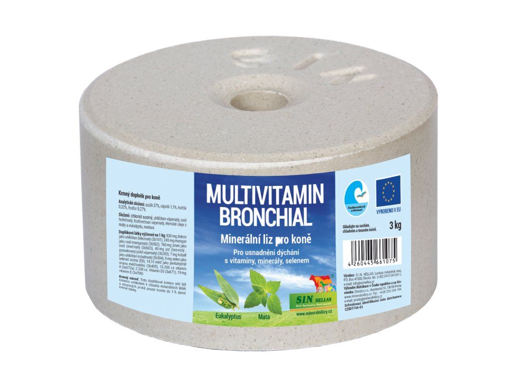 Minerální multivitaminový liz s éterickými oleji z máty a eukalyptu. Liz Broncial obsahuje vedle minerálních látek, stopových prvků a vitamínů navíc přírodní éterické oleje z máty a eukalyptu na zklidnění dýchacích cest a zmírnění dýchacích potíží. Balení 3 kg.