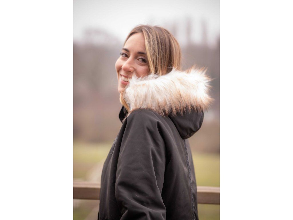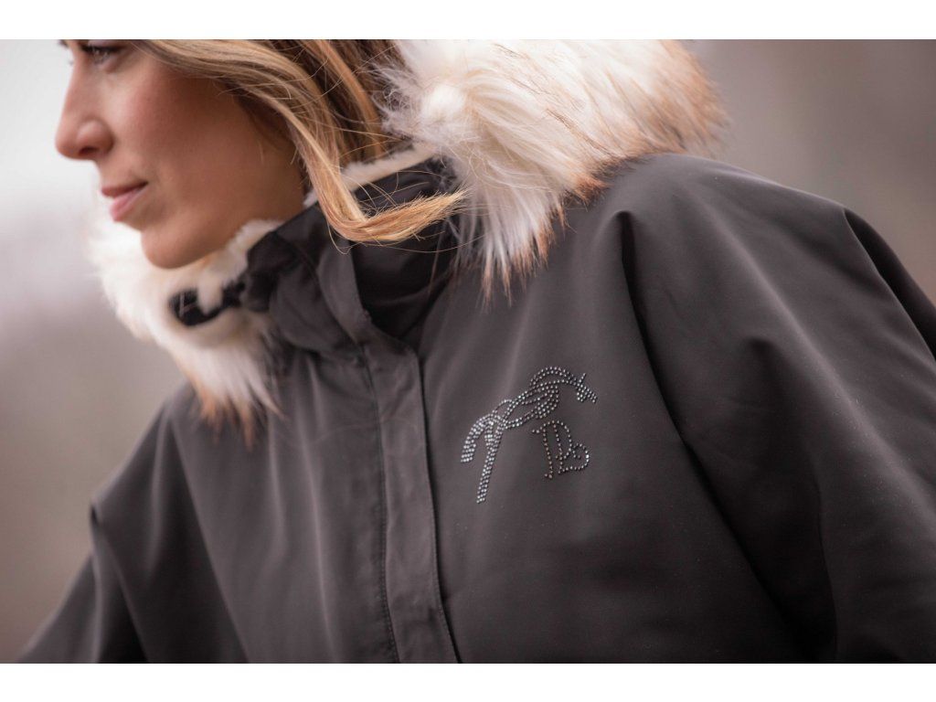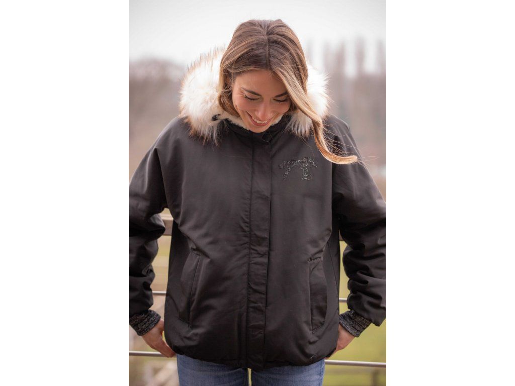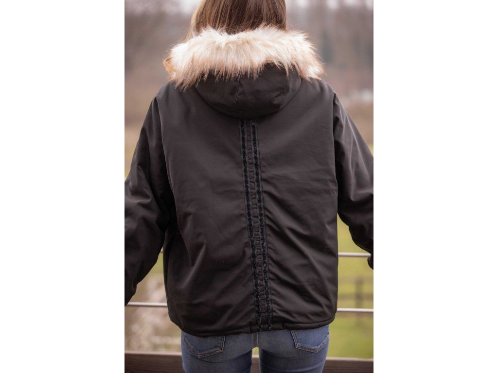 Dámská bunda Aiko v bomber stylu má moderní balonový střih, který lze na spodním lemu lehce stáhnout. Přední zapínání tvoří masivní zip skrytý pod légou. Celá bunda včetně kapuce je podšitá měkkou podšívkou a kapuce je ještě navíc lemovaná umělou kožešinou. Rukávy jsou zakončené pružným úpletem a nechybí ani dvě přední kapsy na zip. Na zádech je lesklý černý dvojitý pruh, který dodává celému kousku elegantní vzhled. Je ideální na podzim i zimu a do města, tak do stáje.