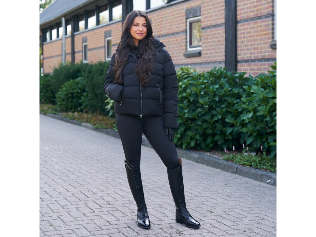 Elegantní prošívaná bunda vhodná do zimního období. Jemné třpytivé kamínky vetkané do látky dodávají bundě styl, zatímco dvoucestný přední zip skrytý pod légou chrání před větrem. Rukávy s manžetami, které mají otvory na palec udrží ruce v teple a zajistí volnost pohybu během jízdy či během práce ve stáji. Bunda má teplé polstrování pro maximální pohodlí, dvě přední kapsy na zip a vnitřní kapsu.