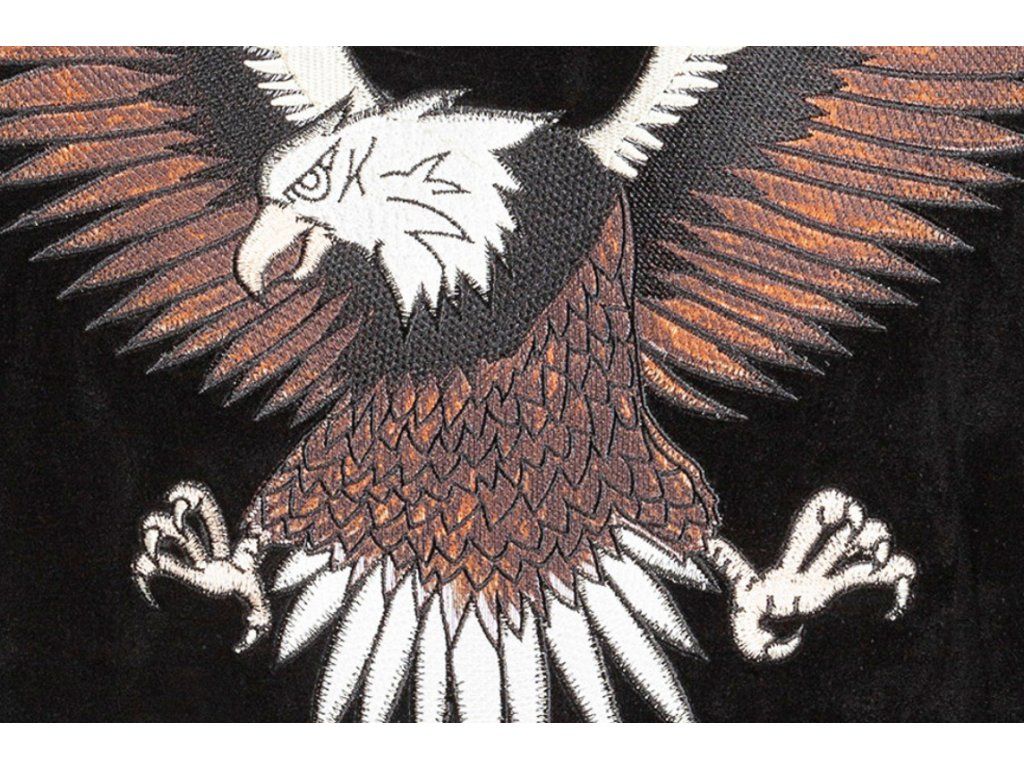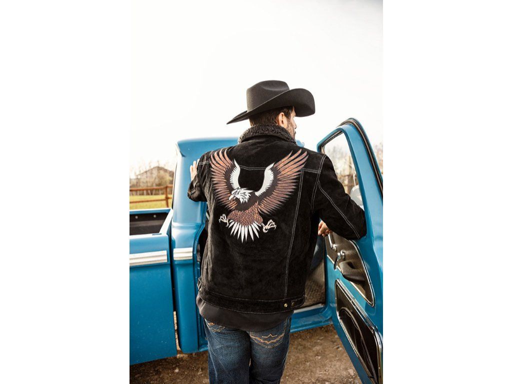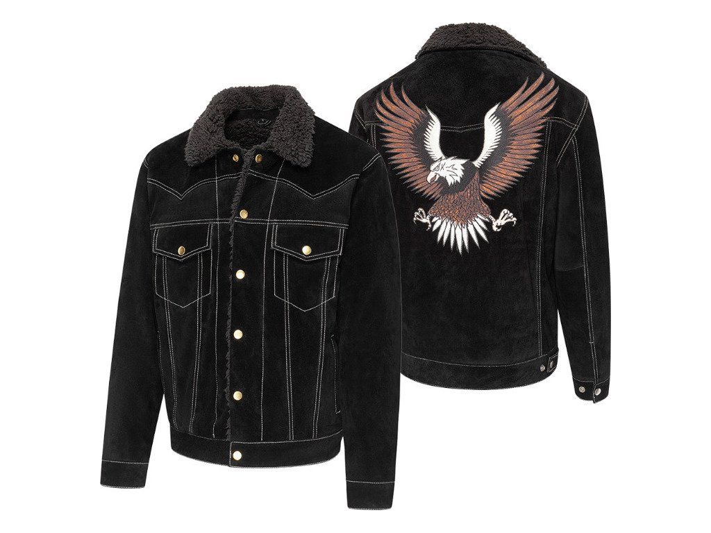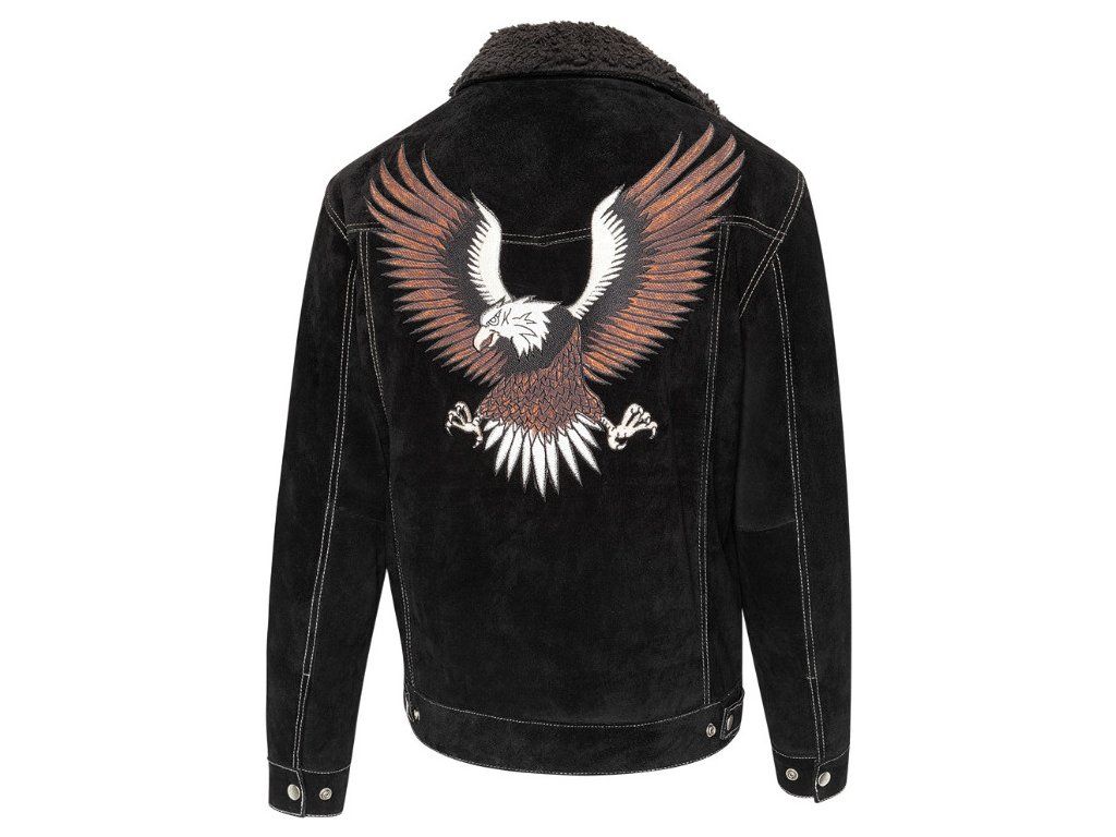 Westernová bunda v semišovém vzhledu s příjemnou vnitřní podšívkou a límečkem ze syntetické kožešiny. Zadní strana je zdobena nádhernou výšivkou orla. Kvalitní kontrastní prošívání a lichotivý střih dělá z bundy nepostradatelný kousek. Spodní lem a rukávy jsou opatřeny kovovými knoflíky pro případnou úpravu šířky. Praktické zapínání na patentky. Nesmí chybět několik praktických kapes - náprsní kapsy na patentky, klasické boční kapsy a dvě kapsy uvnitř.