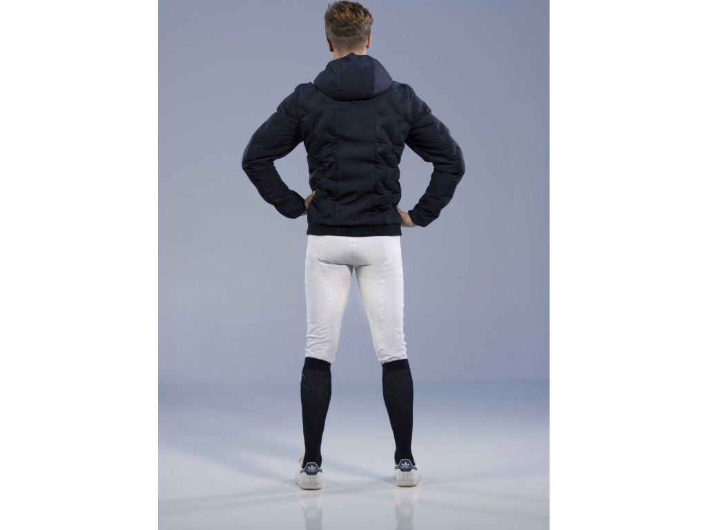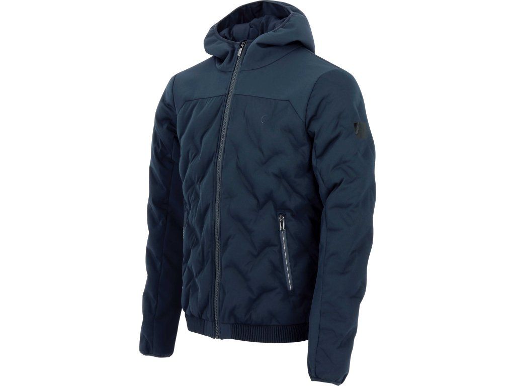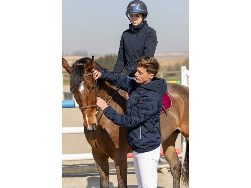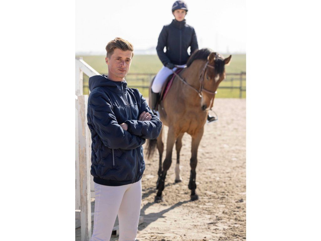 Pohodlná a technicky propracovaná pánská bunda Diagonal je určena pro jezdce, kteří mají rádi sportovní styl a moderní inovace. Díky polstrování bez švů je velmi pohodlná a zároveň výborně tepelně izoluje. Výplň tvoří lehké vláknité kuličky, které představují inovativní alternativu k prachovému peří. Toto polstrování je snadno pratelné, rychleschnoucí a prodyšné. Malé vzduchové kapsy mezi vlákny zaručují stabilní tepelný komfort i při chladném počasí. Vnější tkanina je opatřena vodoodpudivou úpravou DWR (Durable Water Repellent), která chrání před lehkým deštěm a vlhkostí. Hlavní materiál je vícenásobně elastický a zajišťuje optimální volnost pohybu při jízdě i při běžném nošení. Bunda má rovný střih, elastické zakončení spodního lemu a pružný lem na kapuce a rukávech. Kapuce je vybavena praktickým zapínáním na zádech, díky kterému při jízdě nepřekáží. Bunda má zapínání na zip po celé délce a dvě nepromokavé boční kapsy na zip pro bezpečné uložení drobností.
