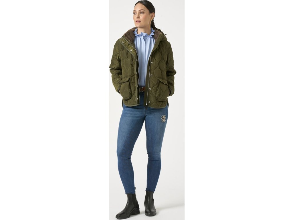 Prošívaná bunda Lara nabízí dokonalé spojení stylu, funkčnosti a pohodlí. Vyrobena z vodoodpudivé tkaniny s celoplošným prošíváním. Bunda poskytuje tepelnou izolaci a zajišťuje teplo i sucho za každého počasí. Vybavena výplní Thinsulate™ z recyklovaného polyesteru – lehká výplň, která si zachovává tvar i po praní. Bunda má přední zapínání na zip se skrytými patentkami, praktické přední kapsy s klopami a bočními kapsami, tónovanou výšivku PS of Sweden a elegantní lemování okrajů. Límec podšitý měkkou umělou kožešinou poskytuje extra komfort. Má kapuci, kterou lze stáhnout dle potřeby. Volný střih zaručuje pohodlné vrstvení během chladnějších dnů. Ideální pro jízdu na koni, cestování i běžné nošení.