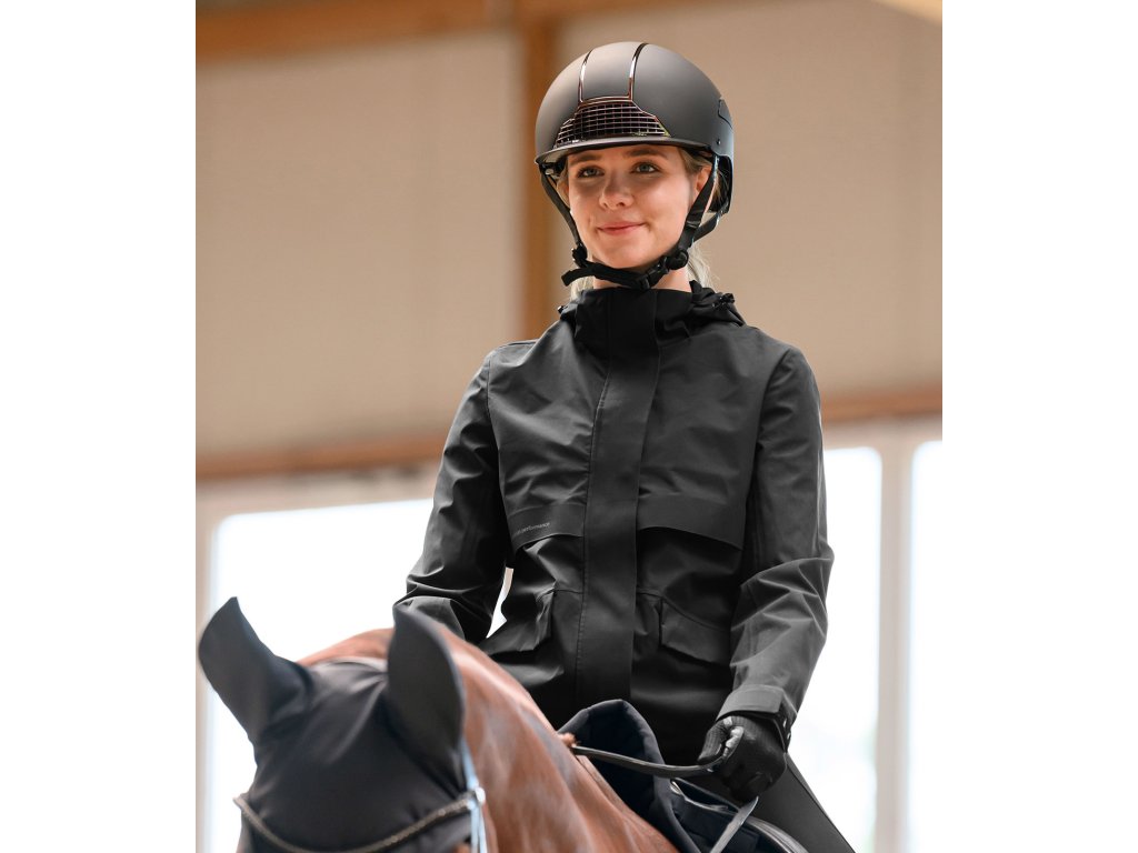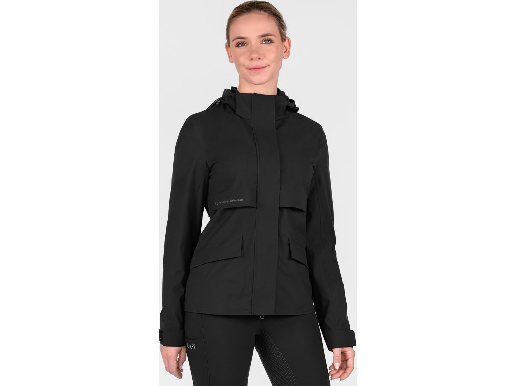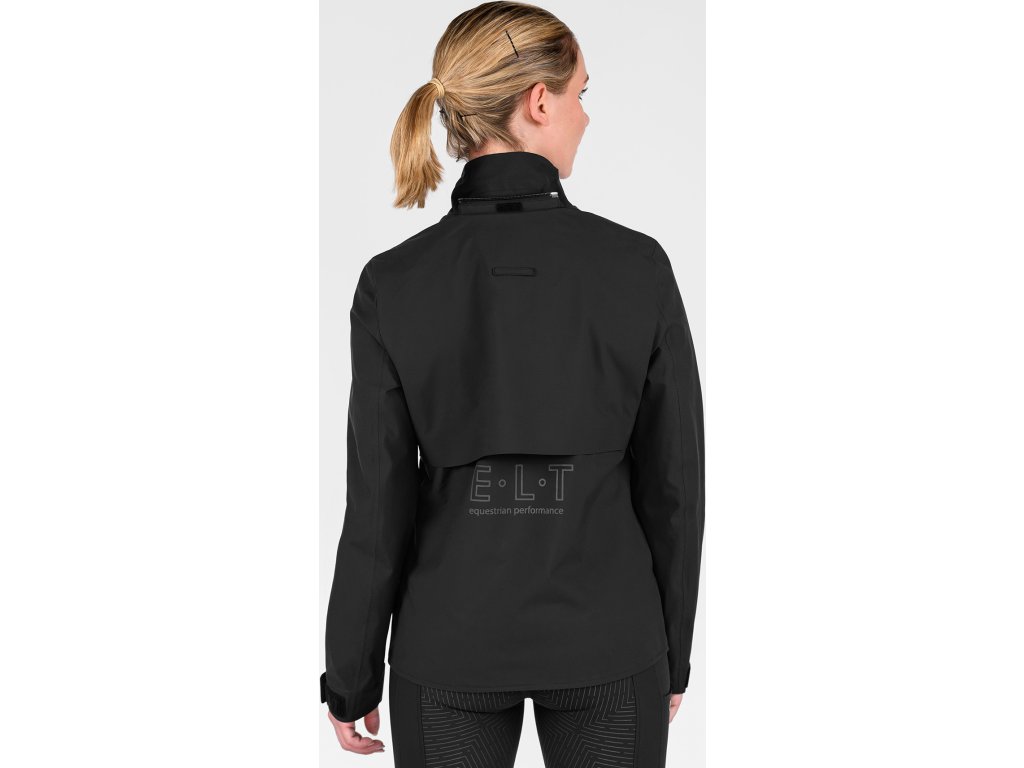 Vysoce funkční dámská bunda je ideální volbou do nepříznivého deštivého počasí. Lichotivý střih se přizpůsobí postavě a zároveň neomezuje v pohybu. Voděodolný materiál s vodním sloupcem 5 000 mm a podlepené švy spolehlivě chrání před deštěm, zatímco prodyšnost 5 000 g/m²/24 h zajišťuje komfort i při vyšší aktivitě. V oblasti zad je bunda rozdělena a vybavena integrovaným ventilačním otvorem pro lepší cirkulaci vzduchu. Vnitřní podšívka ze síťoviny s prodyšností 6 000 g/m²/24 h podporuje odvádění vlhkosti a zvyšuje celkový komfort nošení. Odnímatelná kapuce je plně nastavitelná, lze ji zajistit vzadu a je vybavena stahovací i elastickou šňůrkou pro optimální přizpůsobení. Přední léga je lepená a doplněná skrytými druky, kvalitní dvoucestný zip v kovovém vzhledu má ochranu brady a matně černý kovový taháček s logem E·L·T. Bunda disponuje dvěma předními kapsami překrytými ochrannou klopou, s magnetickým zapínáním a skrytým zipem. Nastavitelné manžety rukávů se suchým zipem umožňují individuální nastavení. Pro vyšší bezpečnost je bunda doplněna reflexním nápisem E·L·T Equestrian Performance a výrazným reflexním potiskem na zadní části. Vrchní materiál i podšívka jsou vyrobeny ze 100% polyesteru, který zajišťuje odolnost a snadnou údržbu.