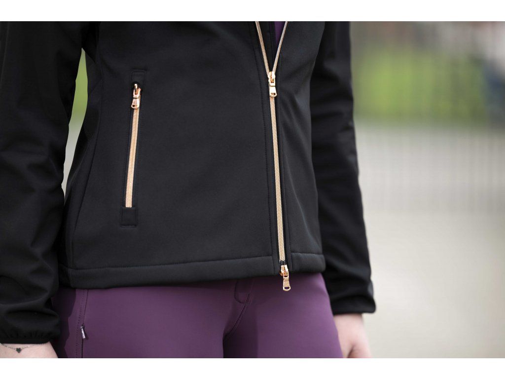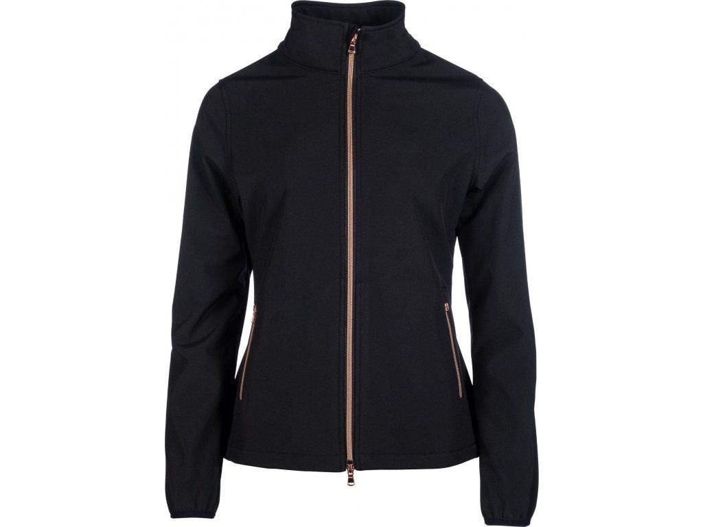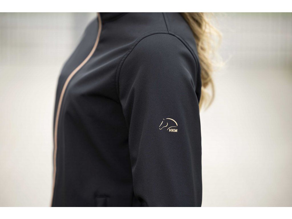 Nepromokavá softshellová bunda s vysokým límcem a vypasovaným střihem od značky HKM. Vyrobena z vysoce hřejivého a větruodolného materiálu, který je navíc snadný na údržbu a neusazuje se na něm špína. Oboustranný zip s krytkou brady umožňuje co nejlepší přizpůsobení se postavě při jízdě. Kontrastní zipy v barvě růžového zlata krásně ozvláštní a dodají bundě elegantnější vzhled. Zdobená malým logem značky na levém rukávu. Vybavena dvěma předními kapsami na zip a elastickým zakončením rukávů. Lze ji prát v pračce na 30 °C. K dispozici ve více barvách.