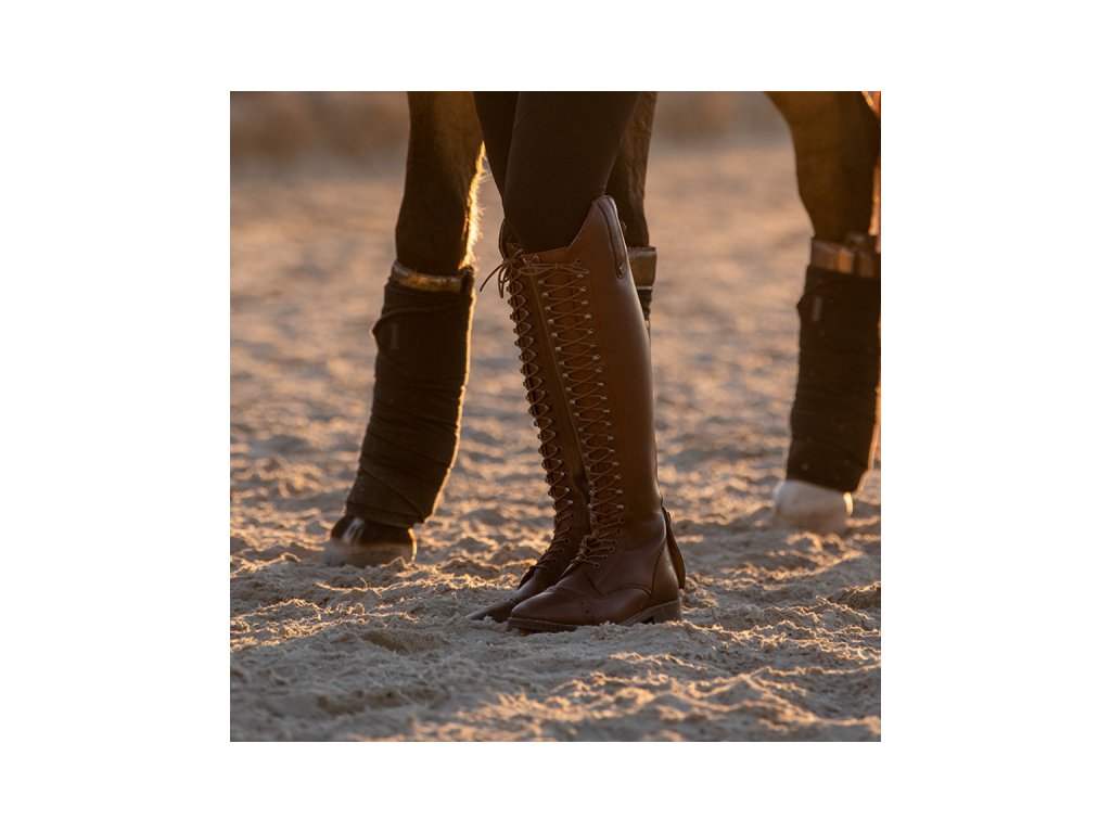Vysoké jezdecké boty vyrobené z kvalitní evropské hovězí kůže s elegantním šněrováním vhodné do zimních chladných dnů. Boty jsou kompletně podšité prodyšnou 100% vlnou. Praktické šněrování poskytuje snadné přizpůsobení požadovaného tvaru lýtka. Díky jazyku, který je připevněný suchým zipem, zůstane šněrování při vyzouvání i nazouvání na místě. Zapínání pomocí podšitého YKK® zipu po celé zadní délce s elastickou vložkou pro snadné nazouvání (elastická vložka s rozptylem až 1 cm). Pomocí koženého pásku a druku lze zip snadno zajistit. Boty jsou dále vybaveny koženou klopou s drukem ve spodní části a s přídavnými zarážkami pro ostruhy. Vnitřní strana je vyrobena z protiskluzové kůže pro perfektní přilnutí. Boty mají gumovou protiskluzovou podrážku a zesílenou patu. Ručně vyrobená pryžová podešev s odnímatelnou, tvarovanou stélkou absorbující nárazy pro pohodlné celodenní nošení. Jezdecké zateplené boty Laval Busse jsou k dispozici v hnědé a černé barvě. K botám lze zakoupit tkaničky v několika barvách. Dále jsou boty k dispozici v různých kombinacích šířky a délky.
