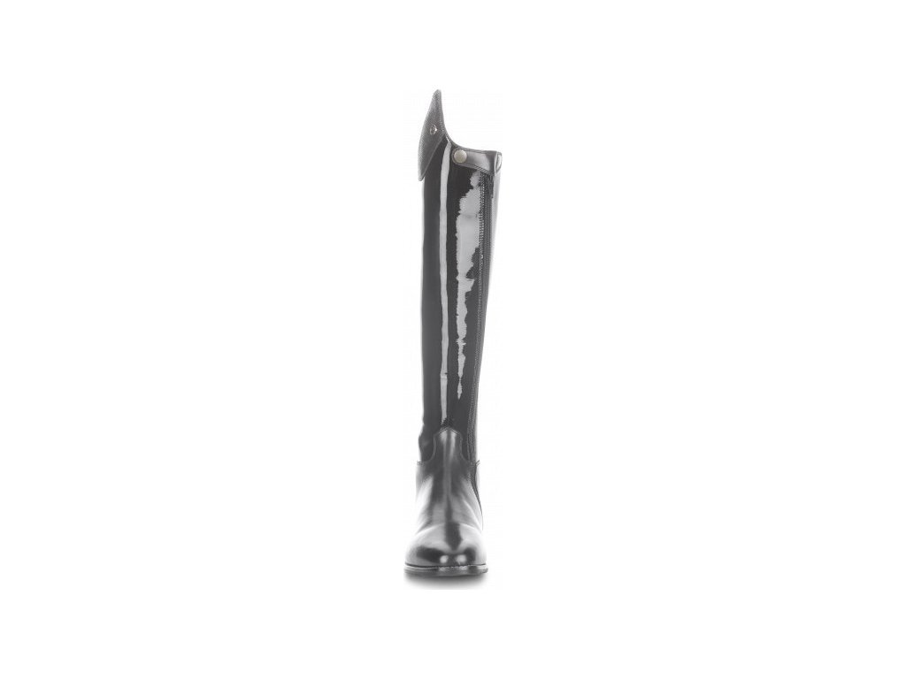 Zajímavá jezdecká dámská obuv, která nabízí perfektní rovnováhu mezi funkčností a okouzlujícím vzhledem. Boty jsou elegantní, pohodlné s přiléhavým střihem. Holeň je z pravé lakované kůže a spodní část vyrobená z nejlepší evropské obuvnické kůže. Lýtková část je z odolné kůže se speciálními adhezivními vlastnostmi pro perfektní přilnavost. Podšívka z pravé kůže. Podložený zip YKK® v přední části boty pro snadné obouvání s perfektní celkovou ergonomií v sedle. Zip je v horní části chráněn koženou klopou na patentní knoflík. Elastická vsadka na zadní vnější straně zajistí optimální se přizpůsobení lýtku s rozptylem až 8 mm. Pevná patní část s dvojitými výstupky pro správné držení ostruh. Gumová podešev je ručně vyráběná s protiskluzovým zvlněným profilem a pevnou patou. Vyjímatelná, předtvarovaná stélka, která tlumí nárazy. K dispozici v šedé a černé barvě. Dále jsou boty k dispozici v různých kombinacích šířky a délky.
