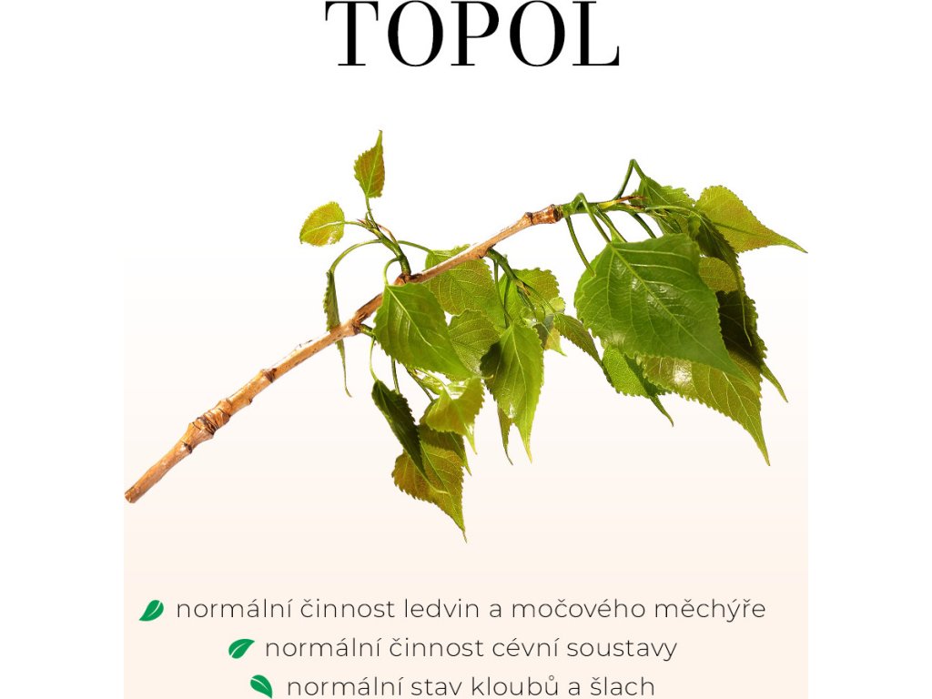 Topol černý - bylinný lihový extrakt. Ledviny a močový měchýř. Topol černý je doporučován pro normální činnost ledvin a močového měchýře. Podporuje normální funkce dýchacího systému a cévní soustavy. Vhodný doplněk pro normální stav kloubů a šlach.