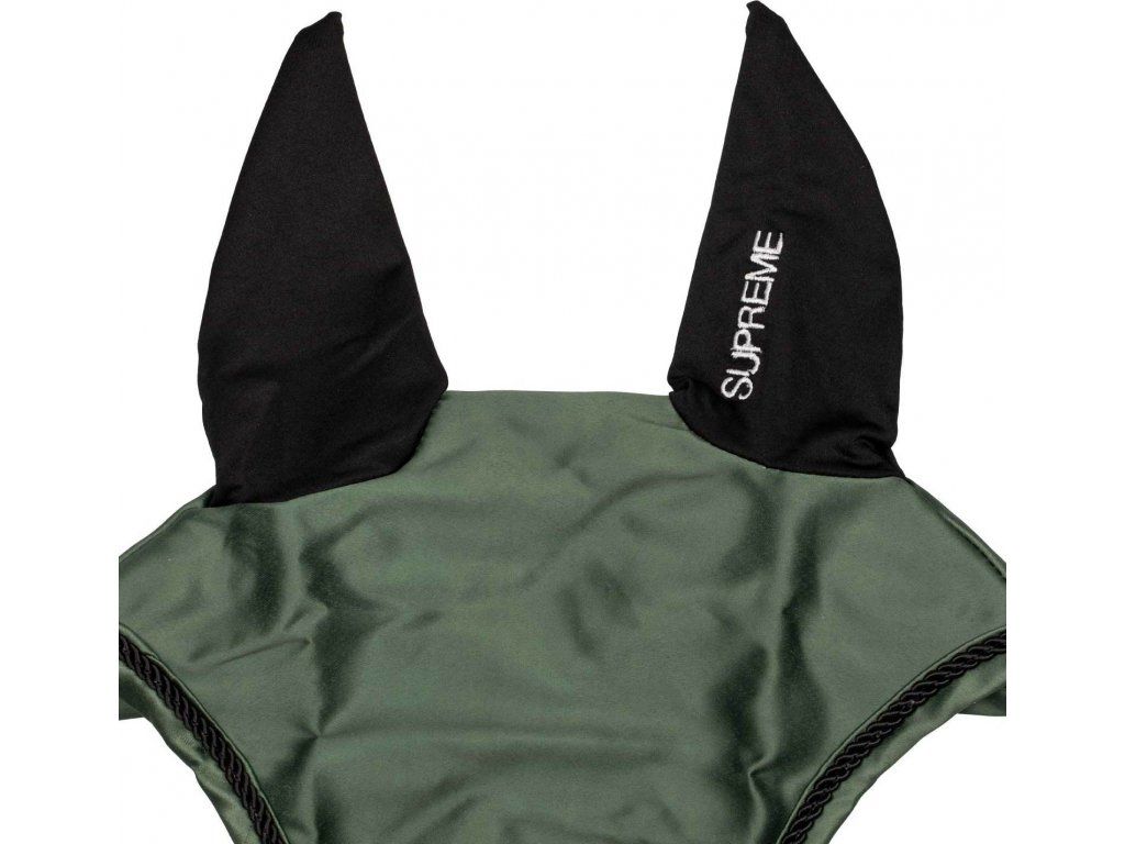 Kvalitní a pohodlná čabraka z látky s hedvábným efektem. Uši jsou vyrobeny ze strečové lycry. Chrání uši koně před hmyzem a redukuje hluk, zabraňuje rozptylování během tréninku. Zdobena logem a nápisem Supreme. Velikost FULL.