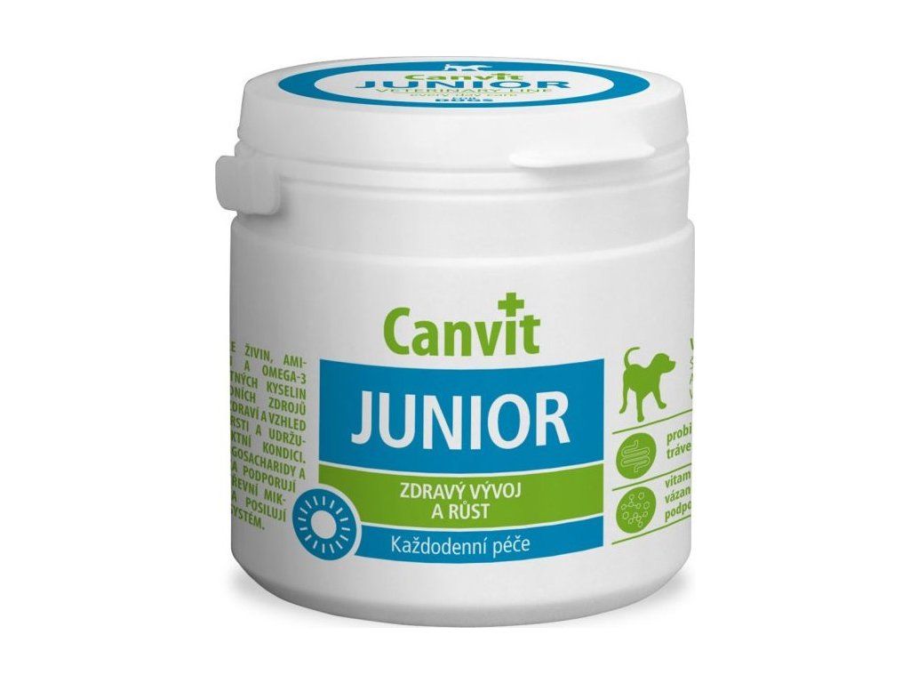 Holistický komplex pro štěňata, mladé psy v růstu a dospělé psy, kteří mají zvýšené nároky na příjem živin, vitamínů, minerálů a dalších nutrientů. Vybalancovaný doplněk stravy Canvit Junior plně pokrývá zvýšené nároky jedinců v růstu i jedinců s oslabenou imunitou - díky tomu významě přispívá k pevnému zdraví, správnému růstu a intenzivně podporuje obranyschopnost. Pomáhá k optimalizaci zažívání a trávení (ideální při přechodu na nové krmivo a v dalších stresových sitacích se kterými se může každý pes potkat - například příchod do nového domova, návštěvy cvičáku, cestování, návštěva veterináře, odčervení atp.) Canvit Junior je bez obsahu umělých barviv, bez chemických dochucovadel a aromat, bez geneticky modifikovaných surovin.
