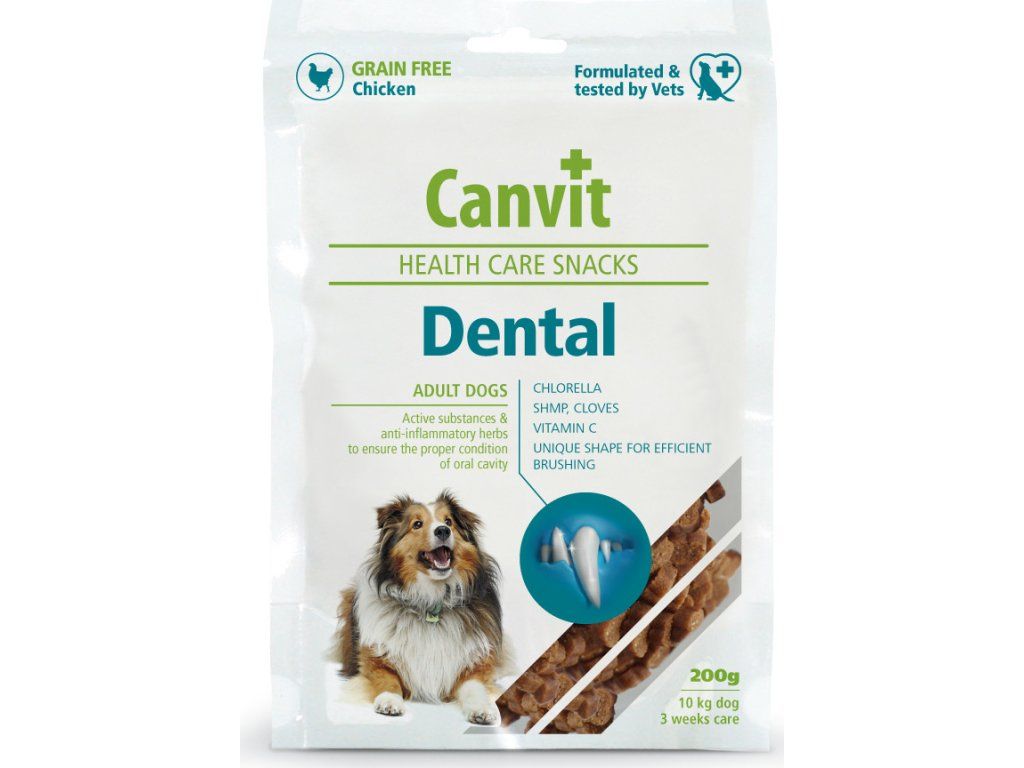 Zubní kámen, plak a zánět dásní je u psů velmi častý problém, který se u psů projevuje nepříjemným zápachem z úst, krvácením z dásní, bolestivostí, neochotou kousat a často končí vytržením zubu. Jedinou účinnou péčí o zuby je prevence zaměřená na snížení tvorby zubního plaku. Chlorella, Hřebíček, omega 3 nenasycené mastné kyseliny, kolagen a hexametafosfát účinně potlačují vznik zubního plaku a dále mají protizánětlivý, antiseptický a hojivý účinek na sliznici dásní. Pamlsek Canvit Dental Health Care Snack se účinně stará o zdravé zuby a dásně, a navíc vašemu psovi skvěle chutná.