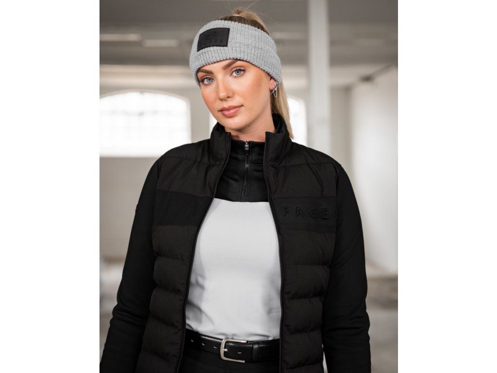 Pohodlná zimní pletená čelenka v šedé barvě, vepředu ražené silikonové logo koně Fager, unisex, jedna velikost.