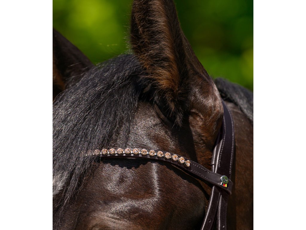 Vysoce kvalitní čelenka zdobena třpytivými kamínky. Vhodná zejména k uzdečkám Waldhausen z řady X-line, ale i k mnoha dalším. Pro výrobu se používá kůže nejvyšší kvality, která se zpracovává v nejzkušenějších řemeslných společnostech pod záštitou firmy Waldhausen.