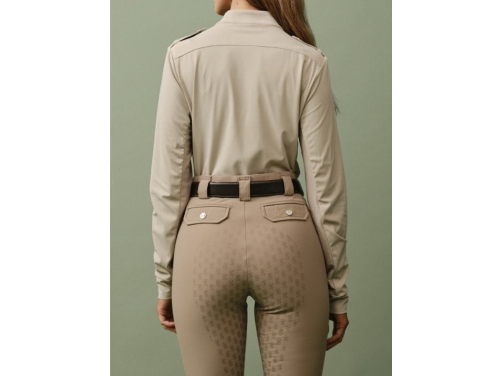 Elegantní sportovní triko vyrobeno z high-tech tkaniny a z čtyřsměrného strečového materiálu. High-tech tkanina zajišťuje prodyšnost materiálu a čtyřsměrný streč pružnost. Triko je na na bocích a v podpaží vybavenou dvojitou síťovinou. Zdobeno elegantními detaily, jako jsou nárameníky či knoflíky s iniciály PS. Vhodné na běžné nošení i ke koním.