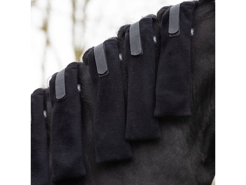 Praktické chrániče na hřívu, které zabrání jejímu vytrhávání či poškození. Jsou ideální při přepravě, v boxe i ve výběhu nebo během závodů. Pomáhají udržet hřívu čistou, chrání ji před zacucháním, drbáním i lámáním. Snadno je upevníte pomocí suchého zipu. Pro nejlepší výsledek doporučujeme hřívu před nasazením chráničů zaplést do malých copánků. Balení: 4 ks. Rozměry: délka 40 cm, šířka 12 cm, zapínání 14 cm.