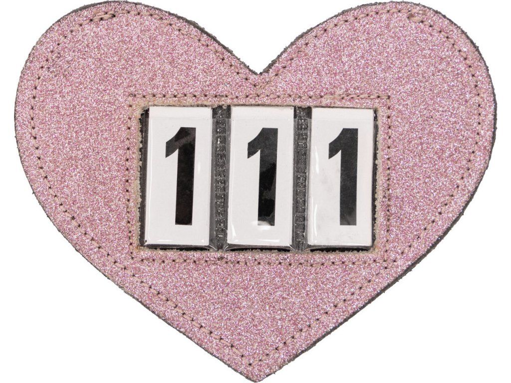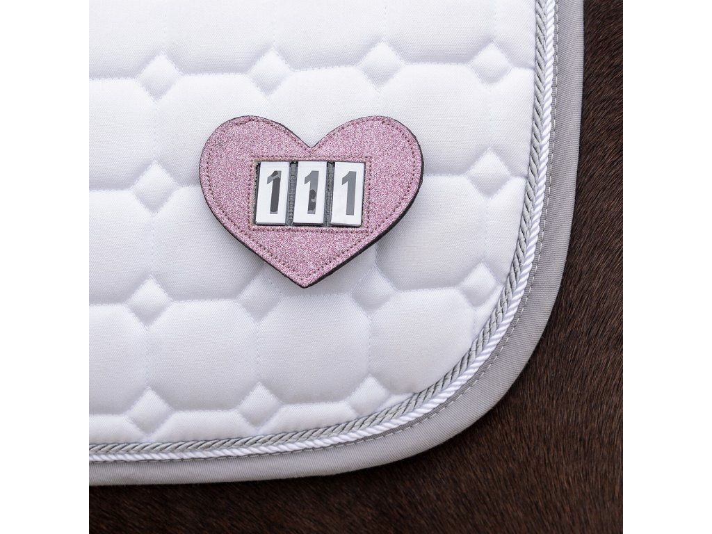 Třímístný číselník na závody ve tvaru srdce s jemnými třpytkami. Dodáván je společně s vyměnitelnými čísly. Lze snadno připnout pomocí suchého zipu a spínacího špendlíku k podsedlové dečce či uzdečce.