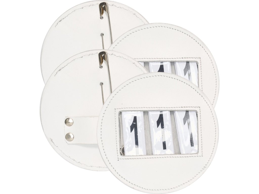 Klasická sada kulatých startovních čísel s koženým vnějším provedením je praktickým a nadčasovým doplňkem pro závody. Díky zapínání na spínací špendlík a druk lze čísla snadno a bezpečně upevnit. Držáky umožňují vložení až tří číslic a jsou vhodné pro různé jezdecké disciplíny.