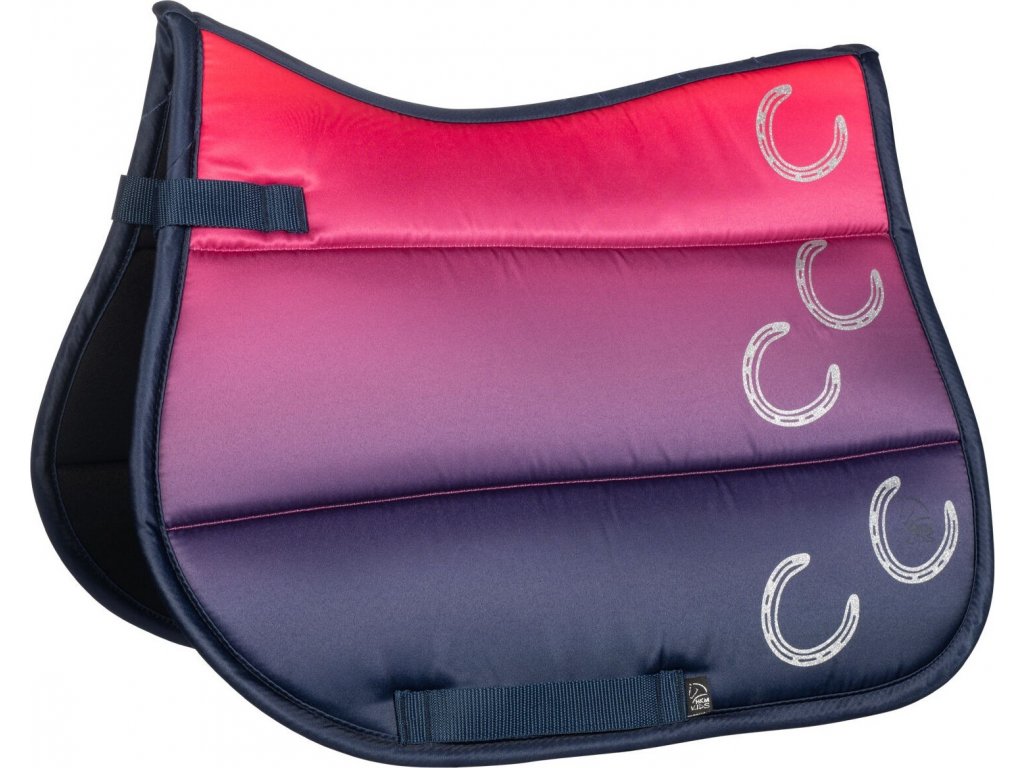 Pohodlná podsedlová dečka vyrobena z prodyšného materiálu. Spodní strana je z funkční tkaniny pro rychlý odvod vlhkosti. Díky anatomickému tvaru perfektně padne. Vybavena sedlovými poutky a poutky na provlečení podbřišníku. Zdobená třpytivým potiskem podkov. Lze ji prát v pračce na 30 stupňů. Před praním je doporučeno zapnout suché zipy. Perfektně ladí k ostatním produktům z kolekce Aymee HKM. Ve velikostech Pony a Shetty.