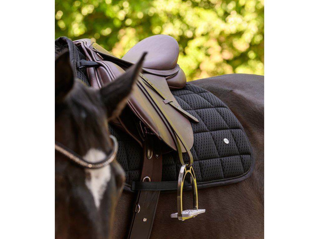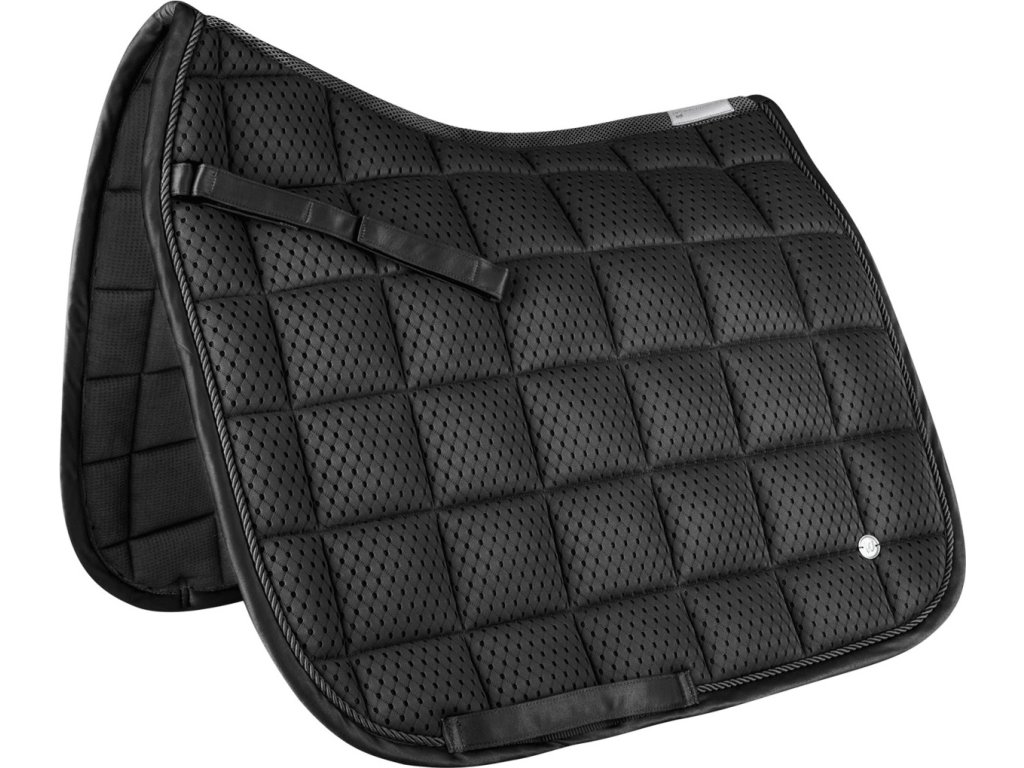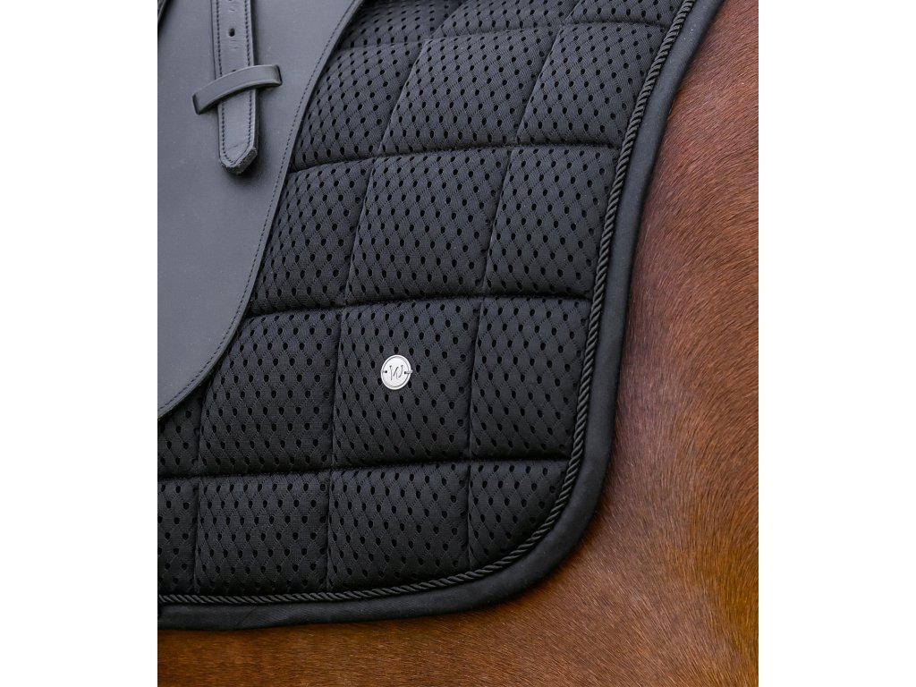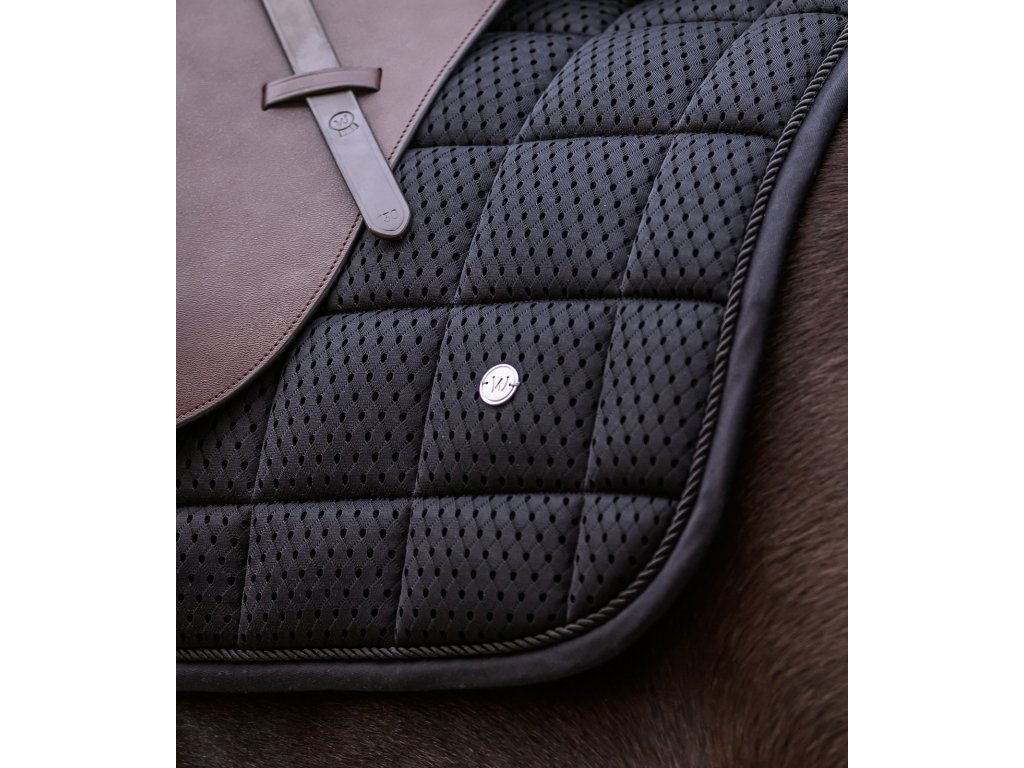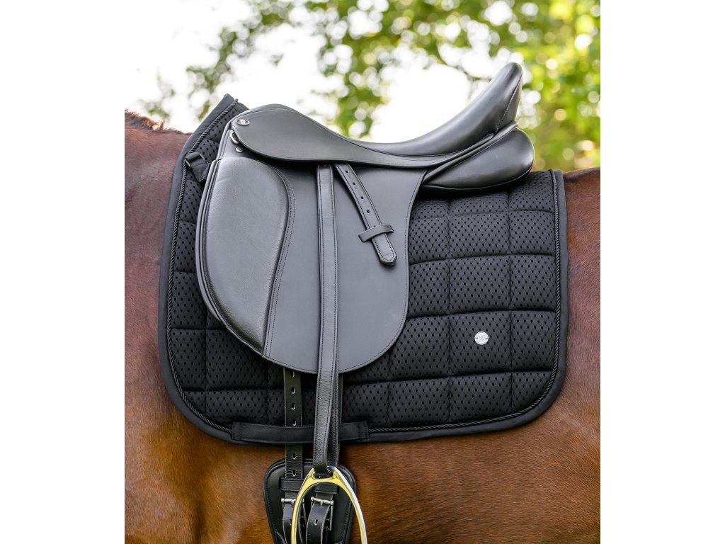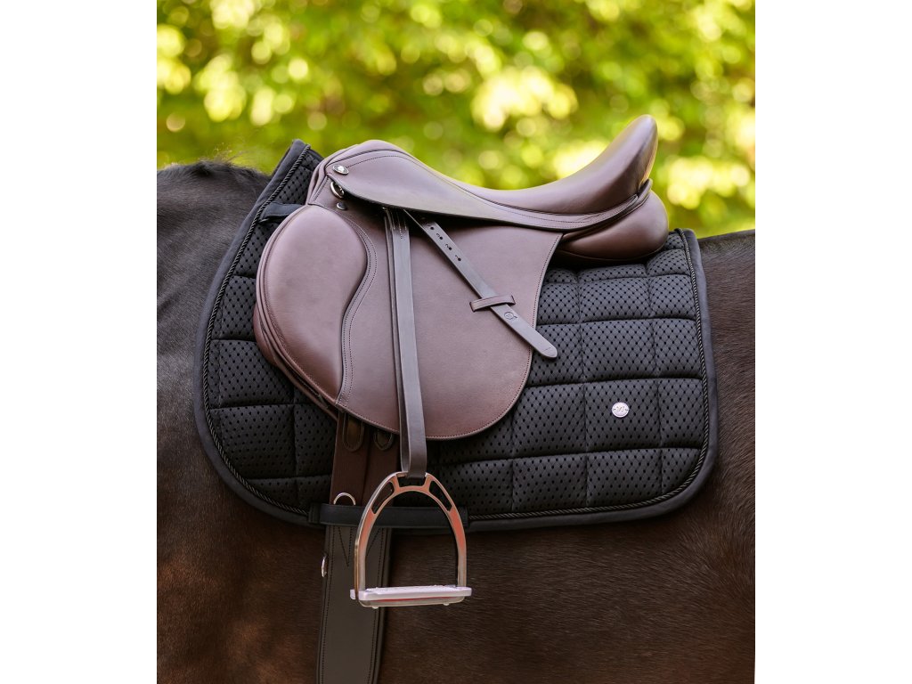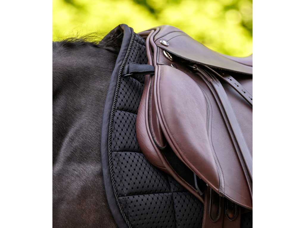 Podsedlová dečka Breath Performance je navržena s důrazem na maximální prodyšnost a efektivní cirkulaci vzduchu. Díky síťovanému materiálu a síťovanému páteřnímu kanálu zajišťuje optimální odvětrávání a pomáhá udržovat hřbet koně v suchu i při intenzivním tréninku. Funkční provedení doplňuje jednoduchá ozdobná paspulka barevně sladěná s dečkou a elegantní stříbrná kovová destička s logem výrobce. Komfort zajišťuje také 10mm pěnová výplň a polstrování o gramáži 300 g/m², které přispívají k rovnoměrnému rozložení tlaku a maximálnímu pohodlí koně.