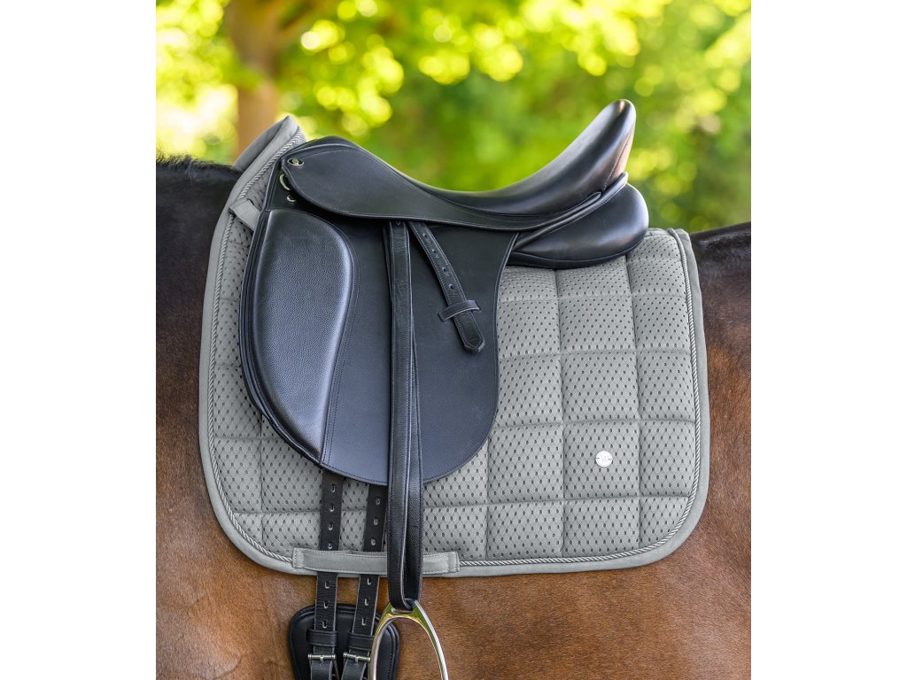 Podsedlová dečka Breath Performance je navržena s důrazem na maximální prodyšnost a efektivní cirkulaci vzduchu. Díky síťovanému materiálu a síťovanému páteřnímu kanálu zajišťuje optimální odvětrávání a pomáhá udržovat hřbet koně v suchu i při intenzivním tréninku. Funkční provedení doplňuje jednoduchá ozdobná paspulka barevně sladěná s dečkou a elegantní stříbrná kovová destička s logem výrobce. Komfort zajišťuje také 10mm pěnová výplň a polstrování o gramáži 300 g/m², které přispívají k rovnoměrnému rozložení tlaku a maximálnímu pohodlí koně.