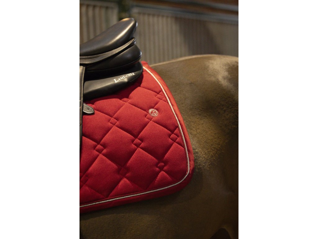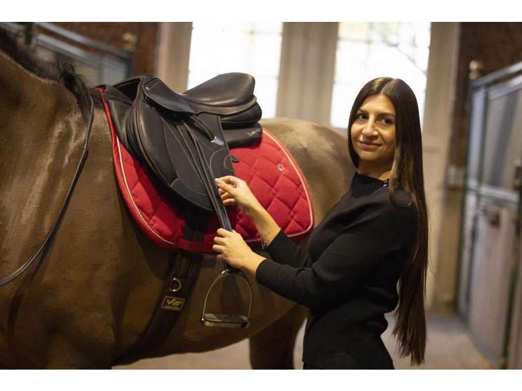 Semišová podsedlová dečka s elegantním prošíváním s 3D efektem. Podšívka je vyrobena z bambusového uhlí, které zajišťuje antibakteriální a termoregulační vlastnosti, čímž zvyšuje pohodlí a ochranu kůže koně. Zdobena kontrastní paspulkou. Vybavena poutky na podbřišník. Lze prát v pračce, nesušte v sušičce.