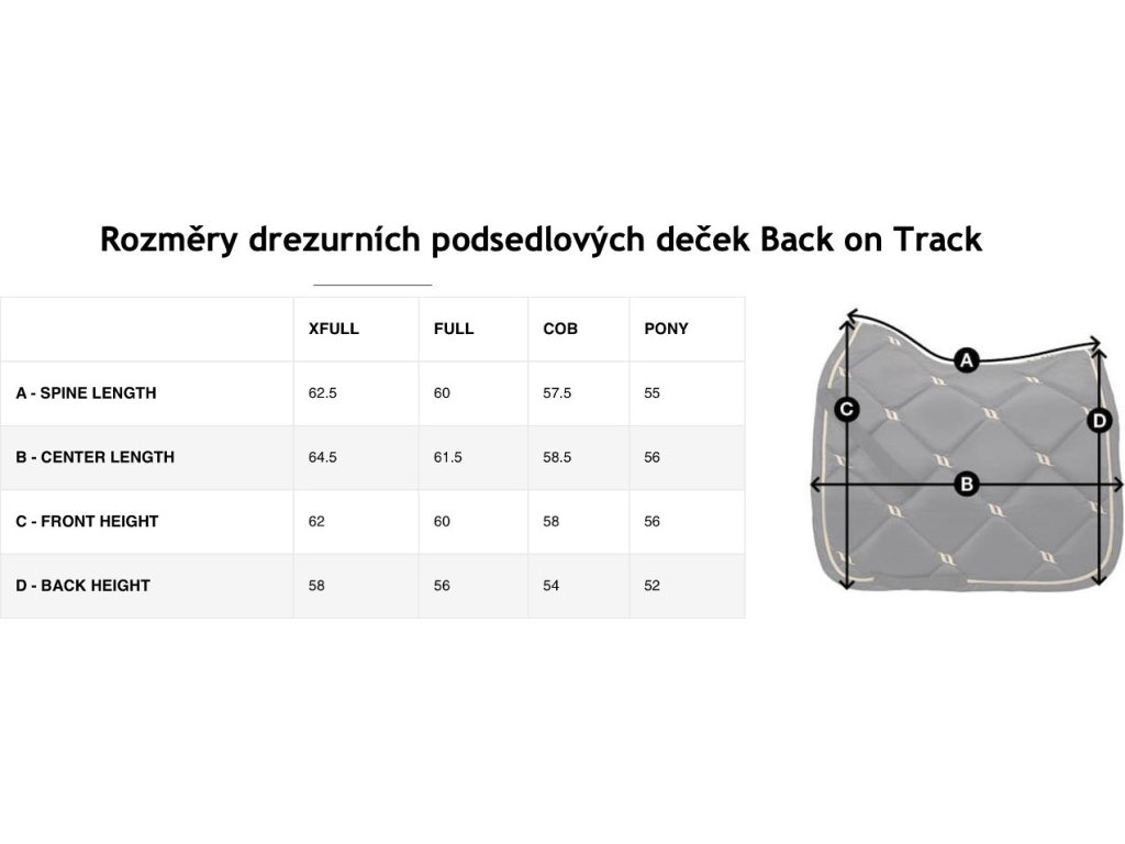 Podsedlová dečka zdobená celoplošným čtvercovým prošíváním. Má poutka na podbřišník, díky kterým skvěle drží na svém místě. Materiál je prodyšný a dobře odvádí vlhkost. Výplň tvoří polyfill a tlumicí pěna, které zajišťují optimální rozložení tlaku. Dečka nabízí terapeutický účinek díky technologii Welltex®. Technologie Welltex® stimuluje prokrvení a může pomoci uvolnit napětí ve svalech. Vždy doporučujeme začít používat Back on Track na kratší dobu a postupně ji prodlužovat, aby se předešlo nežádoucím účinkům.