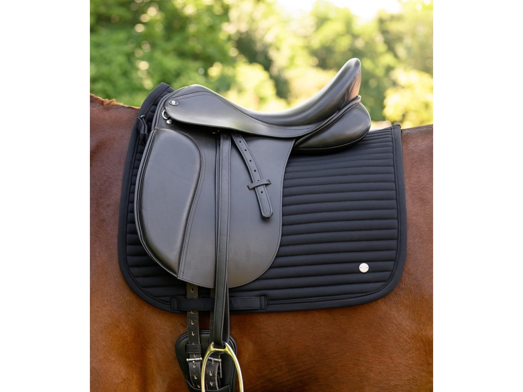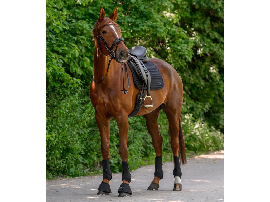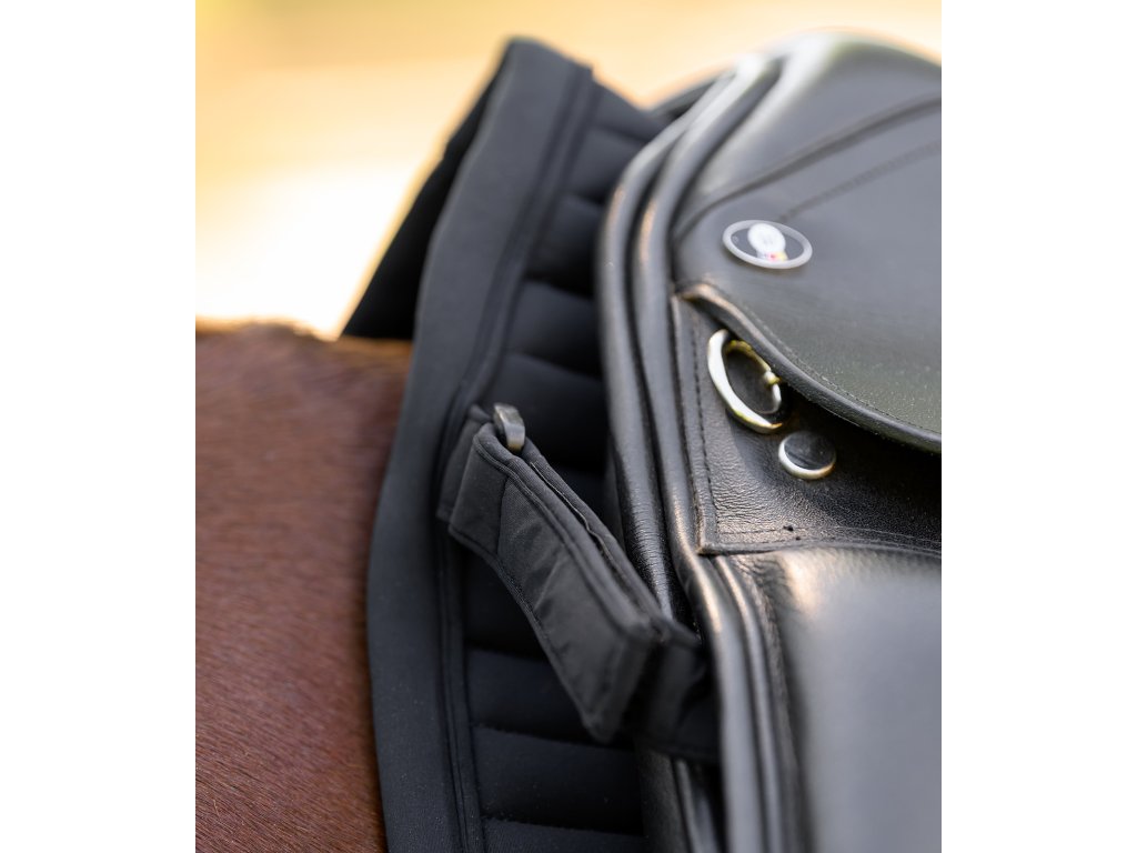 Podsedlová dečka Trinidad zaujme moderním vzhledem a maximální prodyšností. Díky softshellovému materiálu podporuje optimální cirkulaci vzduchu a pomáhá udržovat hřbet koně v komfortu i při intenzivní práci. Je zdobená křížovým prošíváním, lemováním paspulkou a elegantní stříbrnou kovovou destičkou s logem výrobce. Poutko na podbřišník zajišťuje bezpečné upevnění. Stabilitu doplňují i odnímatelná poutka na sedlo se třemi možnostmi uchycení pro přesné nastavení polohy pod sedlem.