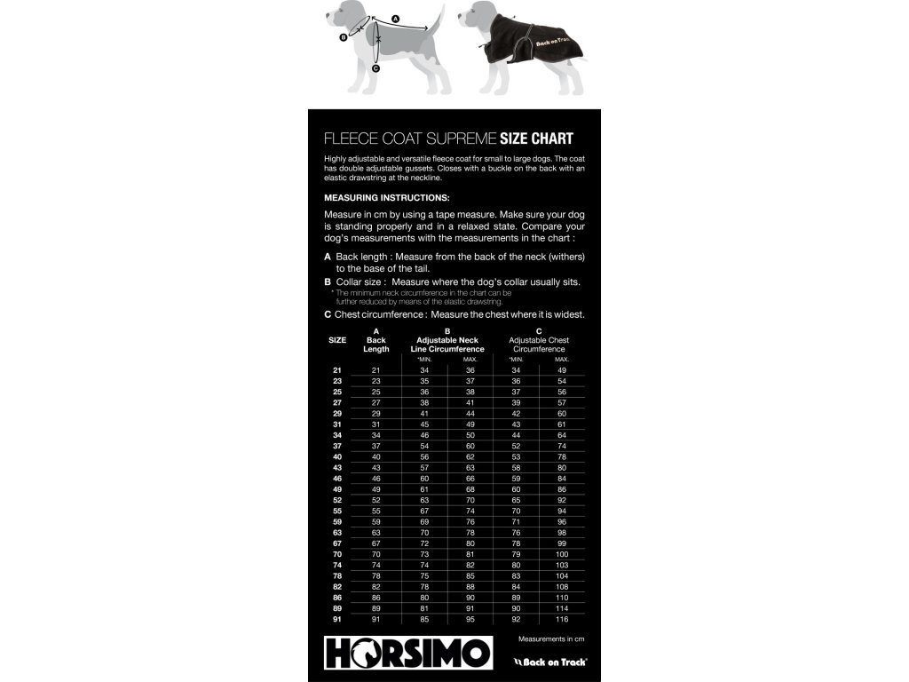 Správnou velikost zjistíte tak, že změříte celkovou délku zad od kohoutku až po kořen ocasu. Pokud naměříte délku, která je mezi, objednejte raději o velikost větší. Mezi obrázky naleznete velikostní tabulku.