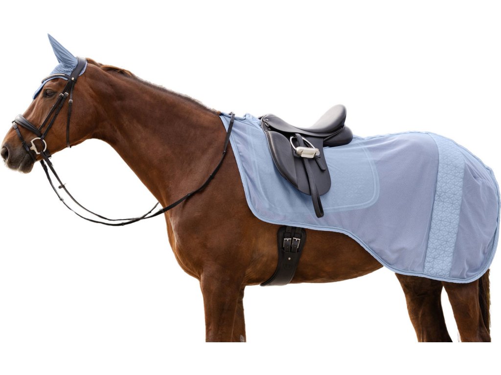 Elegantní bederní deka z prodyšné síťoviny, která chrání koně před otravným hmyzem. Zdobena pruhem s květinovým motivem. Vybavena zapínáním na suchý zip v oblasti kohoutku a šňůrkou pod ocas.