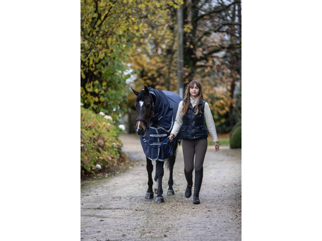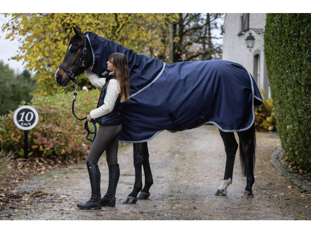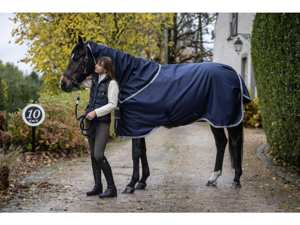 Tato nepromokavá pláštěnka kombinuje voděodolnost a prodyšnost v poměru 3000/3000, díky čemuž spolehlivě chrání koně před vlhkostí a zároveň umožňuje odvod tepla. Polstrování v oblasti kohoutku a hrudi zvyšuje komfort při nošení. Deka je vyrobena z polyesteru o pevnosti 1200 D, který zajišťuje dlouhou životnost. V oblasti krku je materiál pružný pro větší volnost pohybu. Pomocí suchých zipů ji lze kombinovat s odpovídající spodní dekou (linerem) nebo krčním dílem pro dodatečné teplo a ochranu podle potřeby. K praktickým detailům patří velká klopa na ocas, reflexní prvky pro vyšší viditelnost a popruhy mezi nohami. Vnitřní antistatická polyesterová podšívka chrání srst a zajišťuje komfort při nošení. Dodáváno bez krčního dílu.