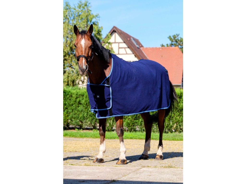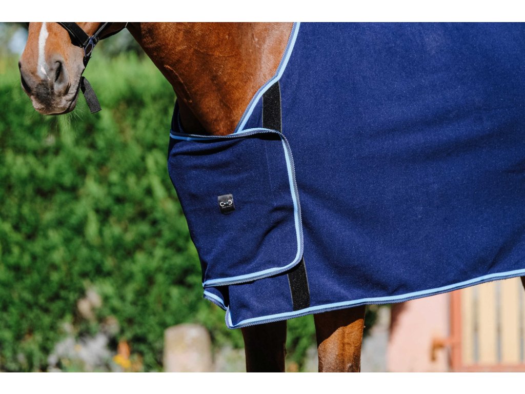 Tato odpocovací deka se vyznačuje velkou hrudní klopou, která nabízí prostor pro výšivku loga nebo sponzora. Vyrobena ze 100 % fleecového vlákna, poskytuje pohodlí a elegantní vzhled, který zvýrazní každého koně při oficiálních příležitostech. Mezi detaily patří ozdobný splétaný lem v oblasti zádě. Doporučujeme prát maximálně na 30 °C a nesušit v sušičce.