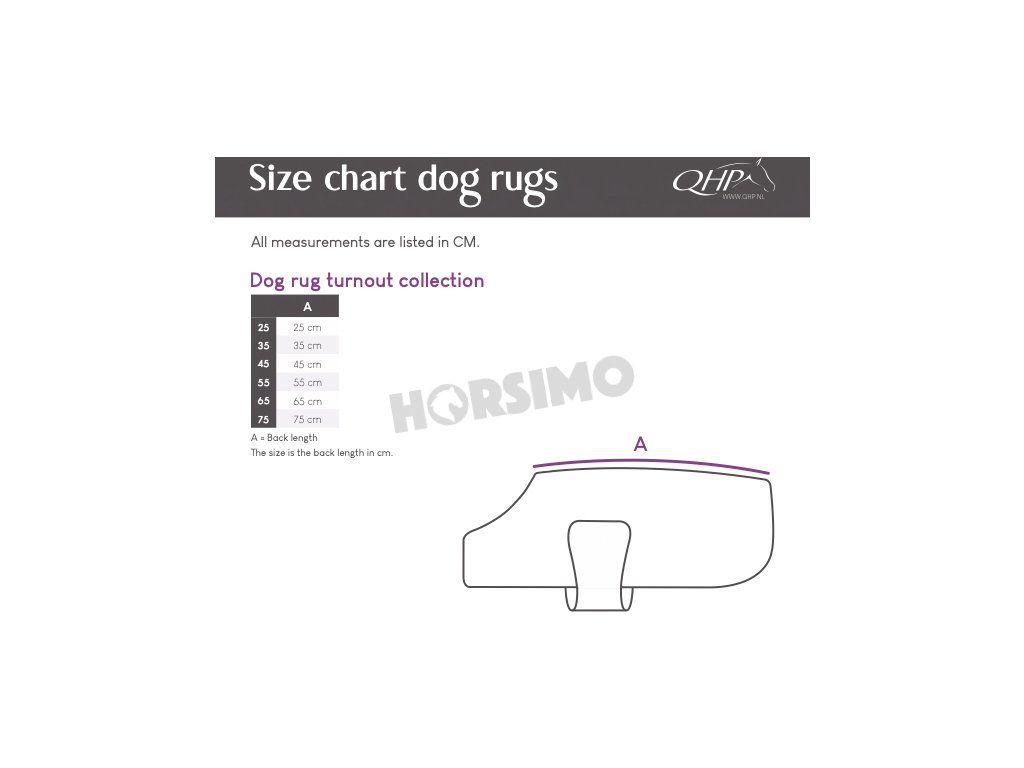 Správnou velikost zjistíte tak, že změříte celkovou délku zad od kohoutku až po kořen ocasu. Pokud naměříte délku, která je mezi, objednejte raději o velikost větší. Uvedená velikost je horní (zádová) délka deky.