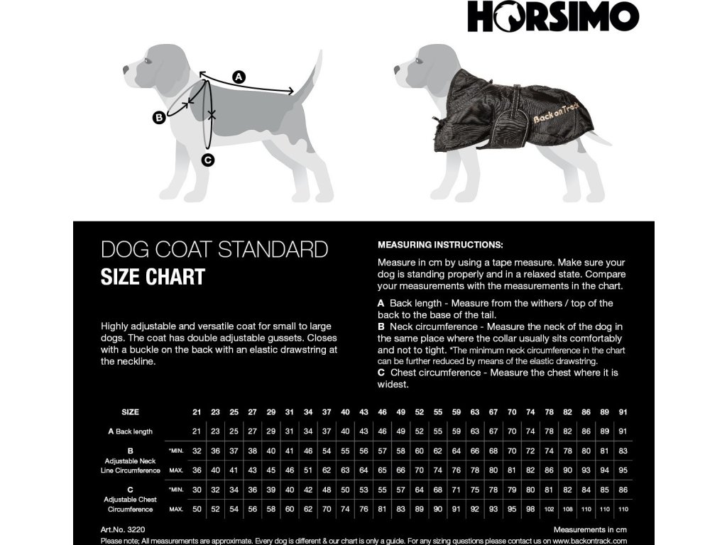 Správnou velikost zjistíte tak, že změříte celkovou délku zad od kohoutku až po kořen ocasu. Pokud naměříte délku, která je mezi, objednejte raději o velikost větší. Mezi obrázky naleznete velikostní tabulku.