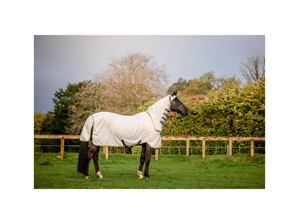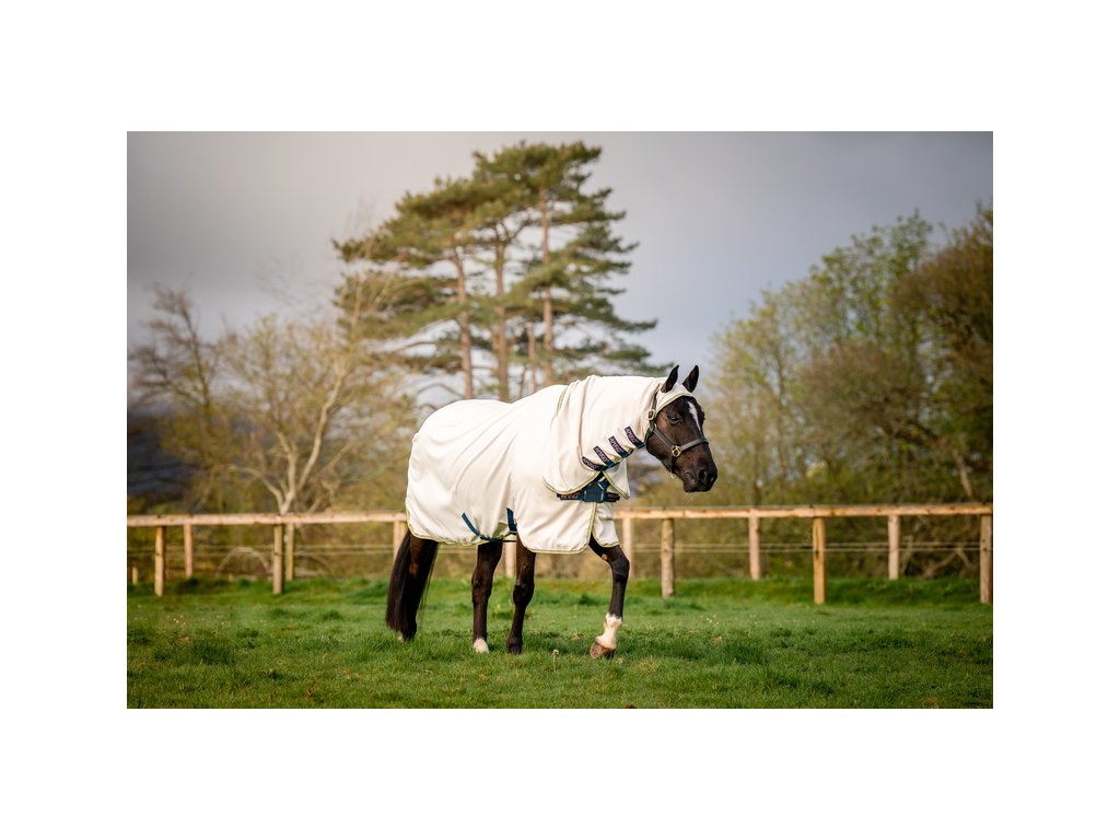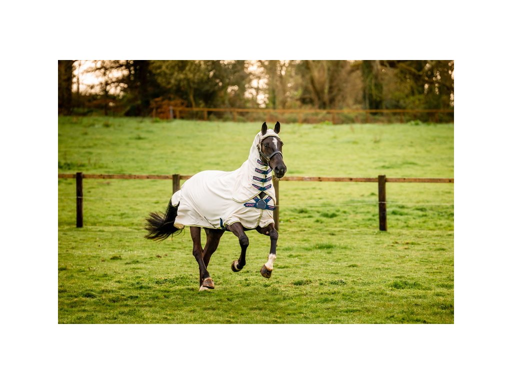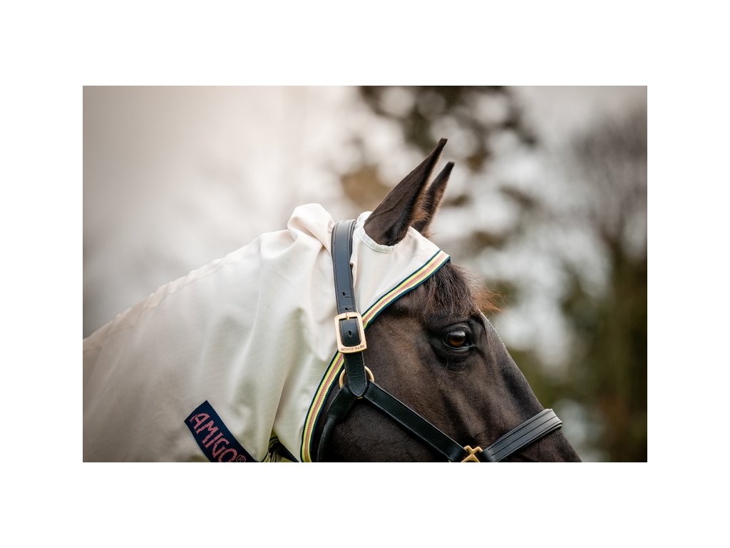 Velmi odolná deka proti hmyzu Amigo Hoody poskytující efektivní ochranu před hmyzem a UV zářením. Dodávaná včetně integrovaného (nelze odepnout) krčního dílu s otvory na uši. Vnější materiál deky je vyroben z prodyšného polyesterového materiálu (s pevností 600 D). Materiál je super lehký a zároveň pevný, vydrží mnoho sezón. Vnitřní hedvábné polstrování v oblasti ramen a krku chrání před odíráním a trháním hřívy. Deka zajišťuje koni maximální komfort, pohodlí a volnost v pohybu. Vybavena předním zapínáním na disk, plným pokrytým břicha včetně křížového zapínání pod břichem, pružným PVC popruhem pod ocasem, extra prodlouženou ochranou ocasu a anatomickým střihem v oblasti nohou. Světlá béžová barva také skvěle odráží sluneční paprsky. Kompatibilní s liner systémem k síťovaným dekám.