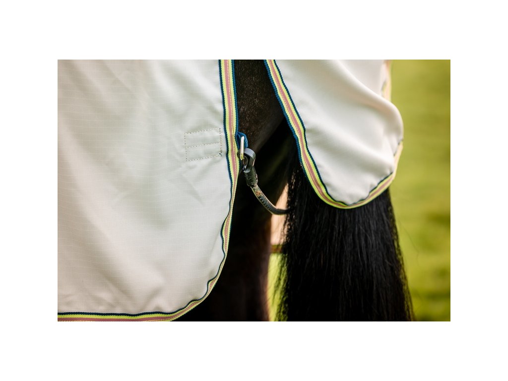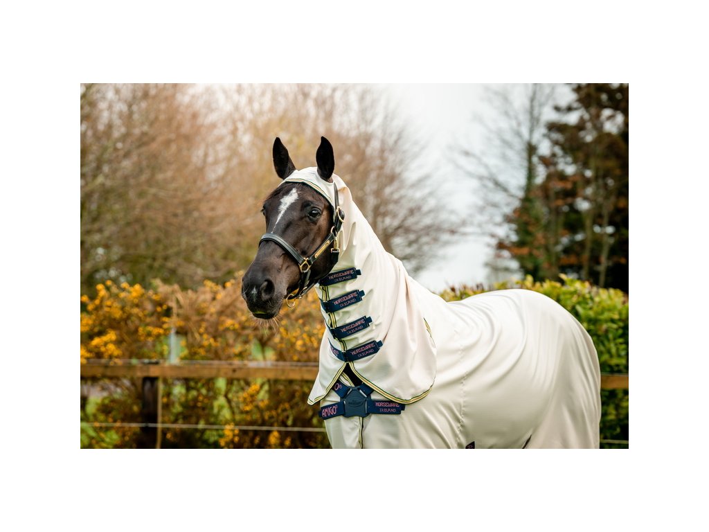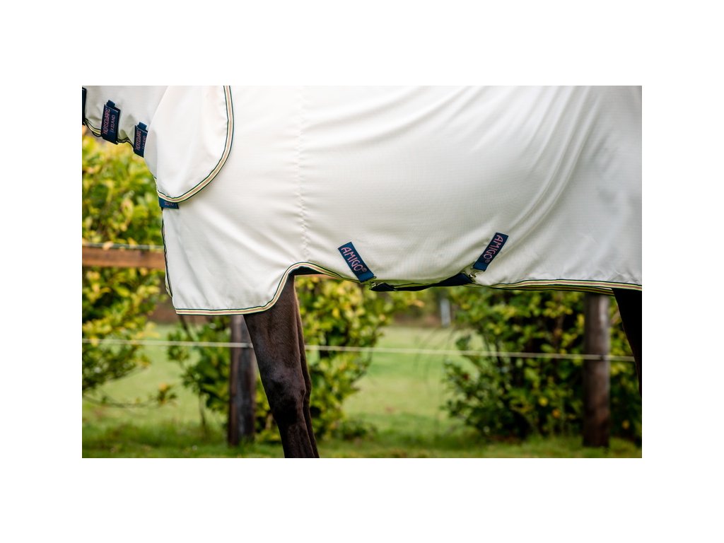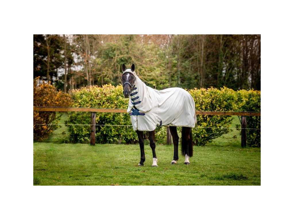 Velmi odolná deka proti hmyzu Amigo Hoody poskytující efektivní ochranu před hmyzem a UV zářením. Dodávaná včetně integrovaného (nelze odepnout) krčního dílu s otvory na uši. Vnější materiál deky je vyroben z prodyšného polyesterového materiálu (s pevností 600 D). Materiál je super lehký a zároveň pevný, vydrží mnoho sezón. Vnitřní hedvábné polstrování v oblasti ramen a krku chrání před odíráním a trháním hřívy. Deka zajišťuje koni maximální komfort, pohodlí a volnost v pohybu. Vybavena předním zapínáním na disk, plným pokrytým břicha včetně křížového zapínání pod břichem, pružným PVC popruhem pod ocasem, extra prodlouženou ochranou ocasu a anatomickým střihem v oblasti nohou. Světlá béžová barva také skvěle odráží sluneční paprsky. Kompatibilní s liner systémem k síťovaným dekám.