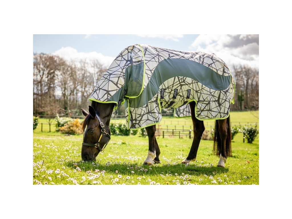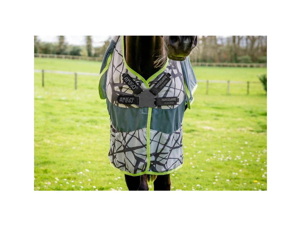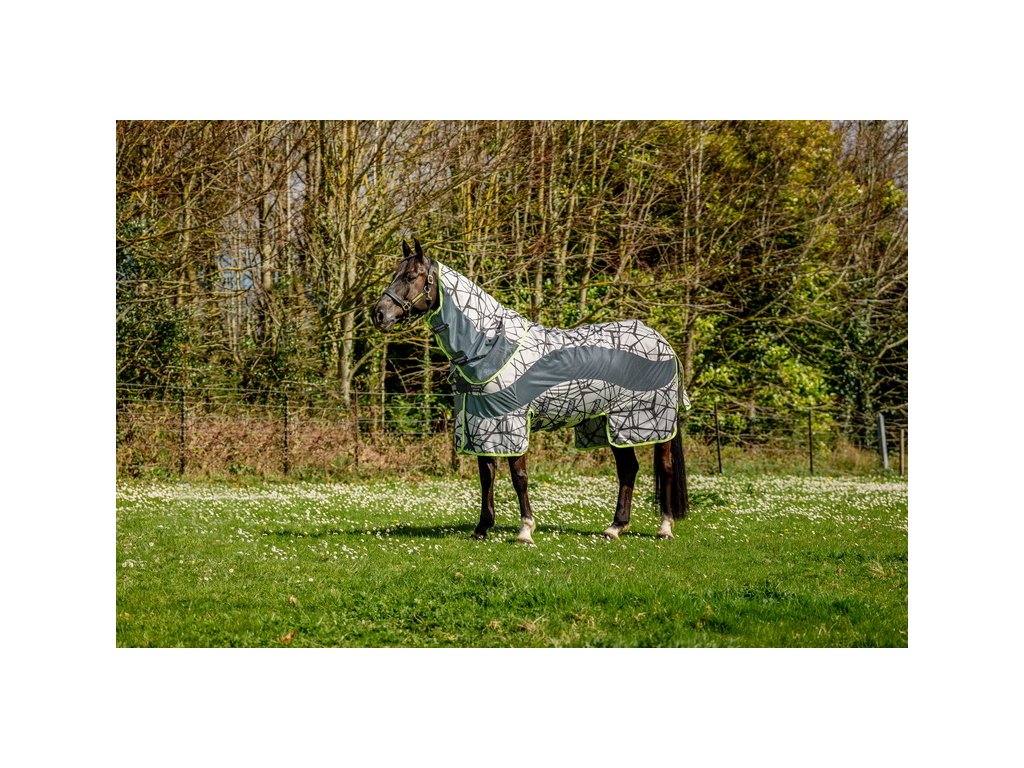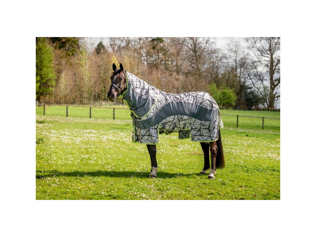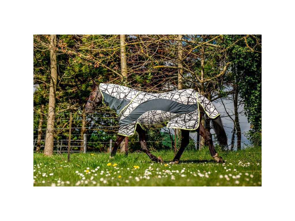 Unikátní deka CamoFly 3v1 Amigo poskytující výbornou ochranu před hmyzem, 65% ochranu před UV zářením a také ochranu před deštěm. Inovativní design prošel řadou výzkumů, které prokázaly, že zebří pruhy působí jako přirozený odstrašující prostředek a je pro hmyz matoucí. Vrstvené černé čáry na šedém pozadí působí na mouchy jako optický klam. Vzor rozbíjí tvar koně a hmyz ho následně nedokáže identifikovat jako cíl. Deka je vyrobena z vnějšího Ripstop polyesterového materiálu, který je odolný před roztržením (pevnost 600 D) a zároveň je nepromokavý. Boční panely jsou vyrobené z polyesterové síťoviny, která zajišťuje maximální prodyšnost. Deka je vybavena předním velmi praktickým a jednoduchým zapínáním na disk. Dále plným pokrytím břicha s trojitým křížovým zapínáním, popruhem pod ocasem, prodlouženou ochranou ocasu a také prodlouženým střihem v oblasti nohou. Dodávána včetně odnímatelného krčního dílu, jehož vrchní část je také nepromokavá.