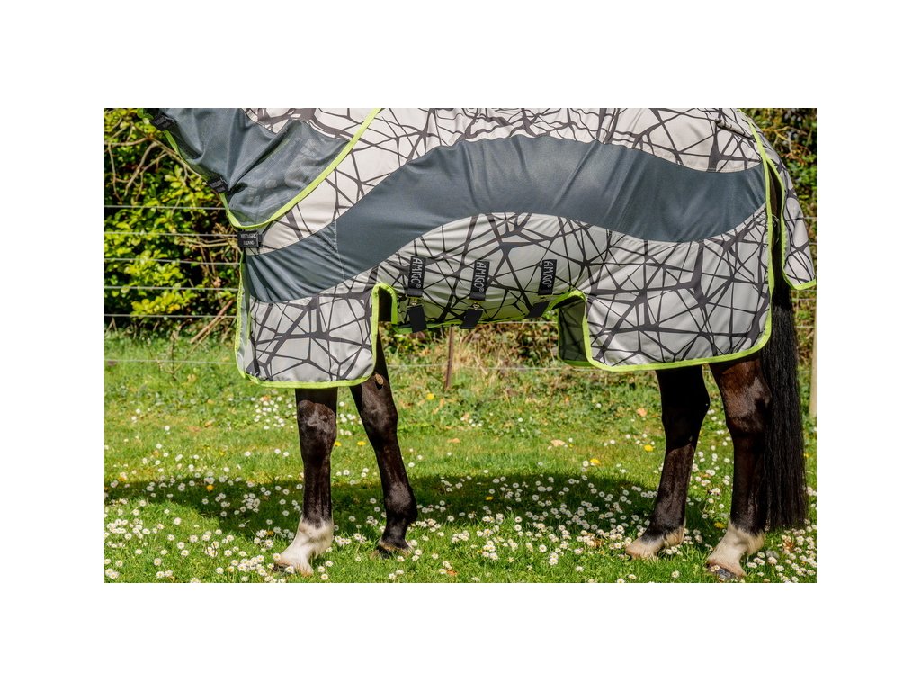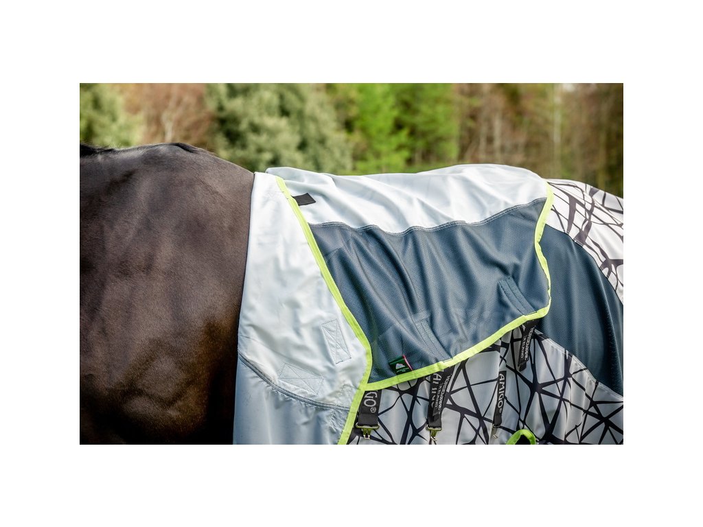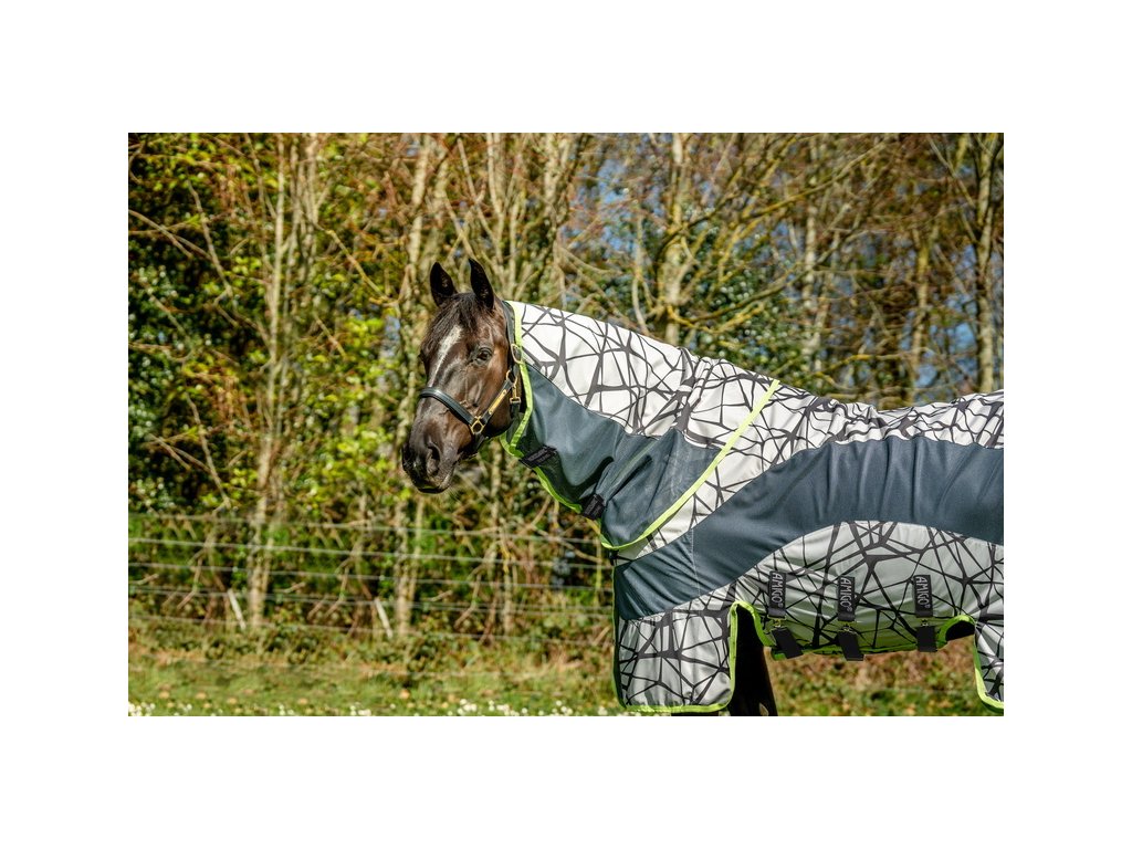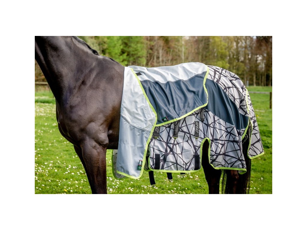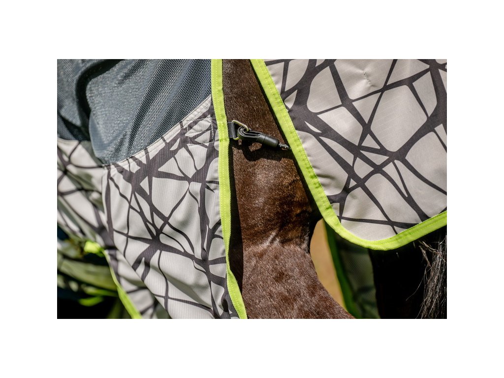 Unikátní deka CamoFly 3v1 Amigo poskytující výbornou ochranu před hmyzem, 65% ochranu před UV zářením a také ochranu před deštěm. Inovativní design prošel řadou výzkumů, které prokázaly, že zebří pruhy působí jako přirozený odstrašující prostředek a je pro hmyz matoucí. Vrstvené černé čáry na šedém pozadí působí na mouchy jako optický klam. Vzor rozbíjí tvar koně a hmyz ho následně nedokáže identifikovat jako cíl. Deka je vyrobena z vnějšího Ripstop polyesterového materiálu, který je odolný před roztržením (pevnost 600 D) a zároveň je nepromokavý. Boční panely jsou vyrobené z polyesterové síťoviny, která zajišťuje maximální prodyšnost. Deka je vybavena předním velmi praktickým a jednoduchým zapínáním na disk. Dále plným pokrytím břicha s trojitým křížovým zapínáním, popruhem pod ocasem, prodlouženou ochranou ocasu a také prodlouženým střihem v oblasti nohou. Dodávána včetně odnímatelného krčního dílu, jehož vrchní část je také nepromokavá.